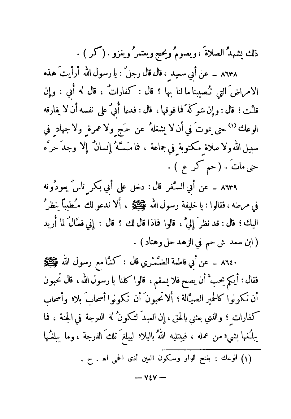 8638- عن أبي سعيد، قال: قال رجل: يا رسول الله أرأيت هذه الأمراض التي تصيبنا ما لنا بها؟ قال: كفارات، قال له أبي: وإن قلت؛ قال: وإن شوكة فما فوقها، قال: فدعا أبي على نفسه أن لا يفارقه الوعك1 حتى يموت في أن لا يشغله عن حج ولا عمرة ولا جهاد في سبيل الله ولا صلاة مكتوبة في جماعة، فما مسه إنسان إلا وجد حره حتى مات. "حم كر ع".