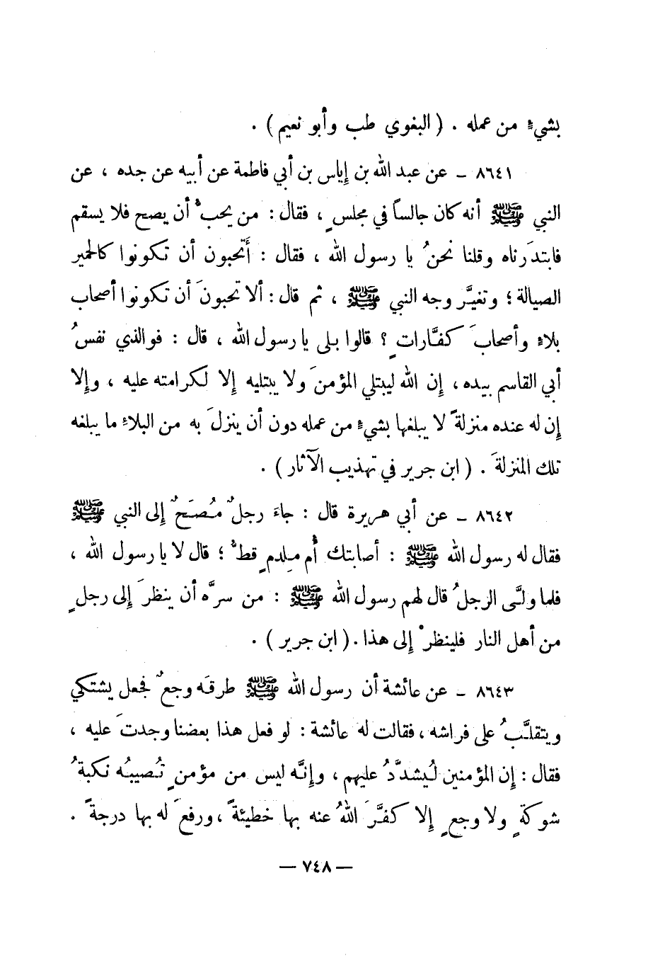 8641- عن عبد الله بن إياس بن أبي فاطمة عن أبيه عن جده، عن النبي صلى الله عليه وسلم أنه كان جالسا في مجلس، فقال: من يحب أن يصح فلا يسقم فابتدرناه وقلنا نحن يا رسول الله، فقال: أتحبون أن تكونوا كالحمير الصيالة؛ وتغير وجه النبي صلى الله عليه وسلم، ثم قال: ألا تحبون أن تكونوا أصحاب بلاء وأصحاب كفارات؟ قالوا بلى يا رسول الله، قال: فوالذي نفس أبي القاسم بيده، إن الله ليبتلي المؤمن ولا يبتليه إلا لكرامته عليه، وإلا إن له عنده منزلة لا يبلغها بشيء من عمله دون أن ينزل به من البلاء ما يبلغه تلك المنزلة. ابن جرير في تهذيب الآثار.