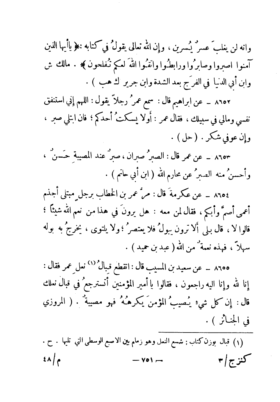 8653- عن عمر قال: الصبر صبران، صبر عند المصيبة حسن، وأحسن منه الصبر عن محارم الله. ابن أبي حاتم.
