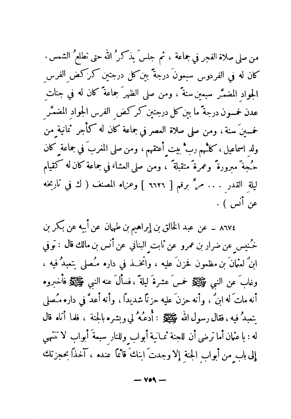8674- عن عبد الخالق بن إبراهيم بن طهمان عن أبيه عن بكر بن خنيس عن ضرار بن عمرو عن ثابت البناني عن أنس بن مالك قال: توفي ابن لعثمان بن مظعون فحزن عليه، واتخذ في داره مصلى يتعبد فيه، وغاب عن النبي صلى الله عليه وسلم خمس عشرة ليلة، فسأل عنه النبي صلى الله عليه وسلم فأخبروه أنه مات له ابن، وأنه حزن عليه حزنا شديدا، وأنه أعد في داره مصلى يتعبد فيه، فقال رسول الله صلى الله عليه وسلم: أدعه لي وبشره بالجنة، فلما أتاه قال له: يا عثمان أما ترضى أن للجنة ثمانية أبواب وللنار سبعة أبواب لا تنتهي إلى باب من أبواب الجنة إلا وجدت ابنك قائما عنده، آخذا بحجزتك