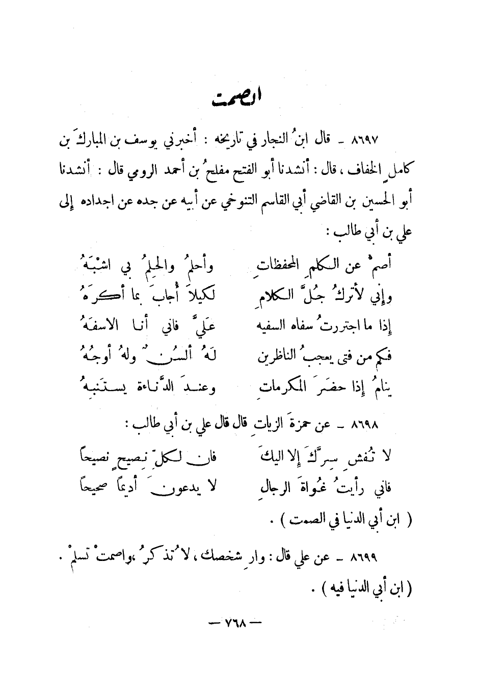 8697- قال ابن النجار في تاريخه: أخبرني يوسف بن المبارك بن كامل الخفاف، قال: أنشدنا أبو الفتح مفلح بن أحمد الرومي قال: أنشدنا أبو الحسين بن القاضي أبي القاسم التنوخي عن أبيه عن جده عن أجداده إلى علي بن أبي طالب: