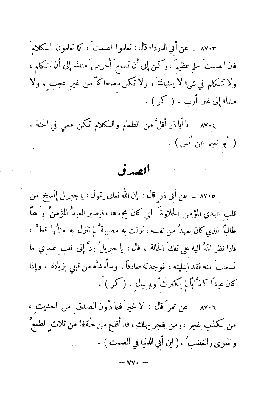 8706- عن عمر قال: لا خير فيما دون الصدق من الحديث، من يكذب يفجر، ومن يفجر يهلك، قد أفلح من حفظ من ثلاث الطمع والهوى والغضب. ابن أبي الدنيا في الصمت.