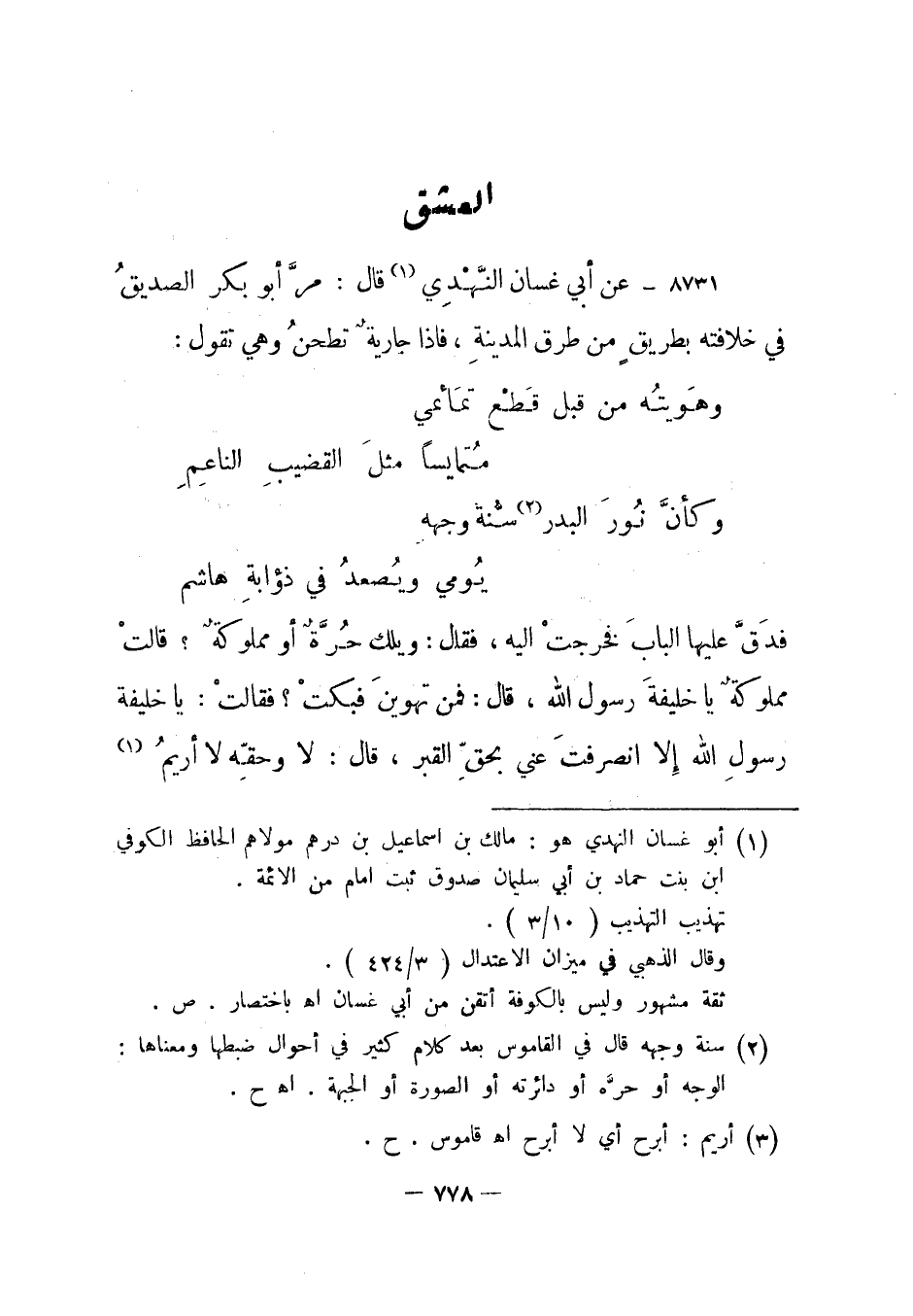 8731- عن أبي غسان النهدي1 قال: مر أبو بكر الصديق في خلافته بطريق من طرق المدينة، فإذا جارية تطحن وهي تقول: