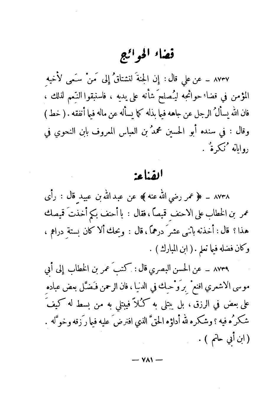 8739- عن الحسن البصري قال: كتب عمر بن الخطاب إلى أبي موسى الأشعري اقنع بروحك في الدنيا، فإن الرحمن فضل بعض عباده على بعض في الرزق، بل يبتلى به كلا فيبتلي به من بسط له كيف شكره فيه؟ وشكره لله أداؤه الحق الذي افترض عليه فيما رزقه وخوله. ابن أبي حاتم.