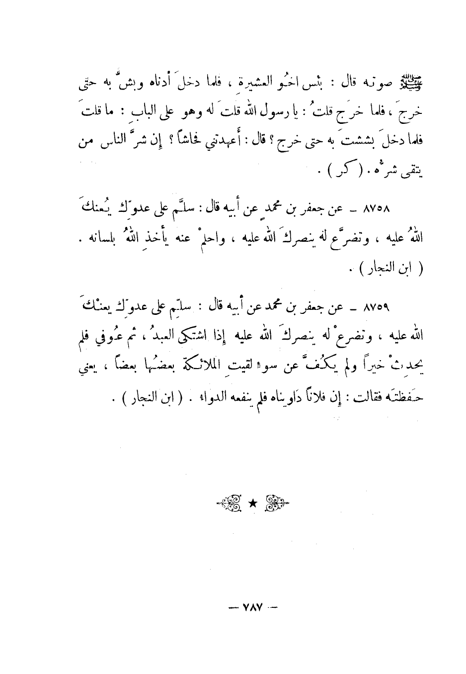 8758- عن جعفر بن محمد عن أبيه قال: سلم على عدوك يعنك الله عليه، وتضرع له ينصرك الله عليه، واحلم عنه يأخذ الله بلسانه. ابن النجار.