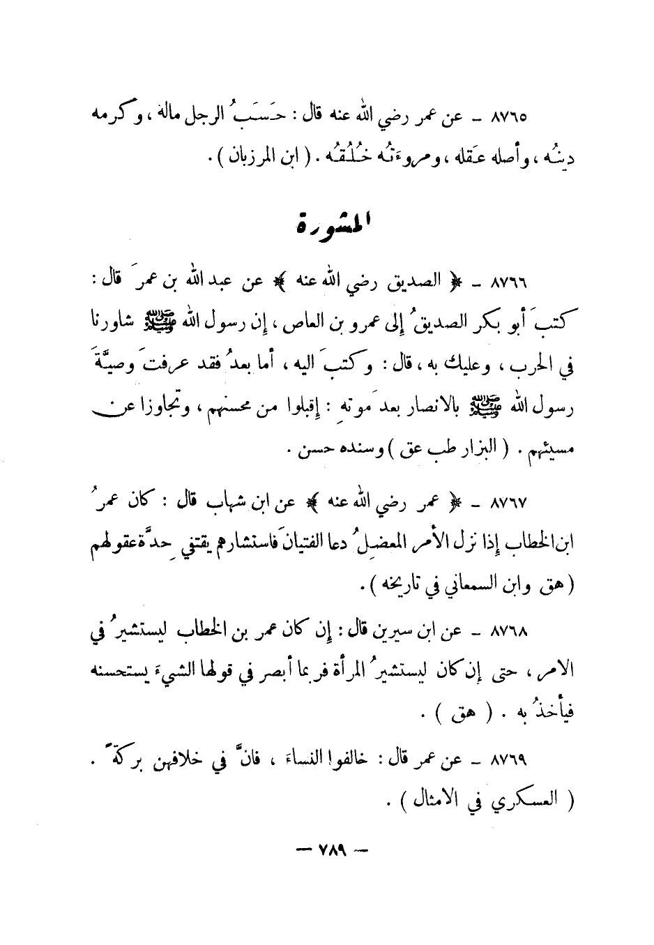 8768- عن ابن سيرين قال: إن كان عمر بن الخطاب ليستشير في الأمر، حتى إن كان ليستشير المرأة فربما أبصر في قولها الشيء يستحسنه فيأخذ به. "هق".
