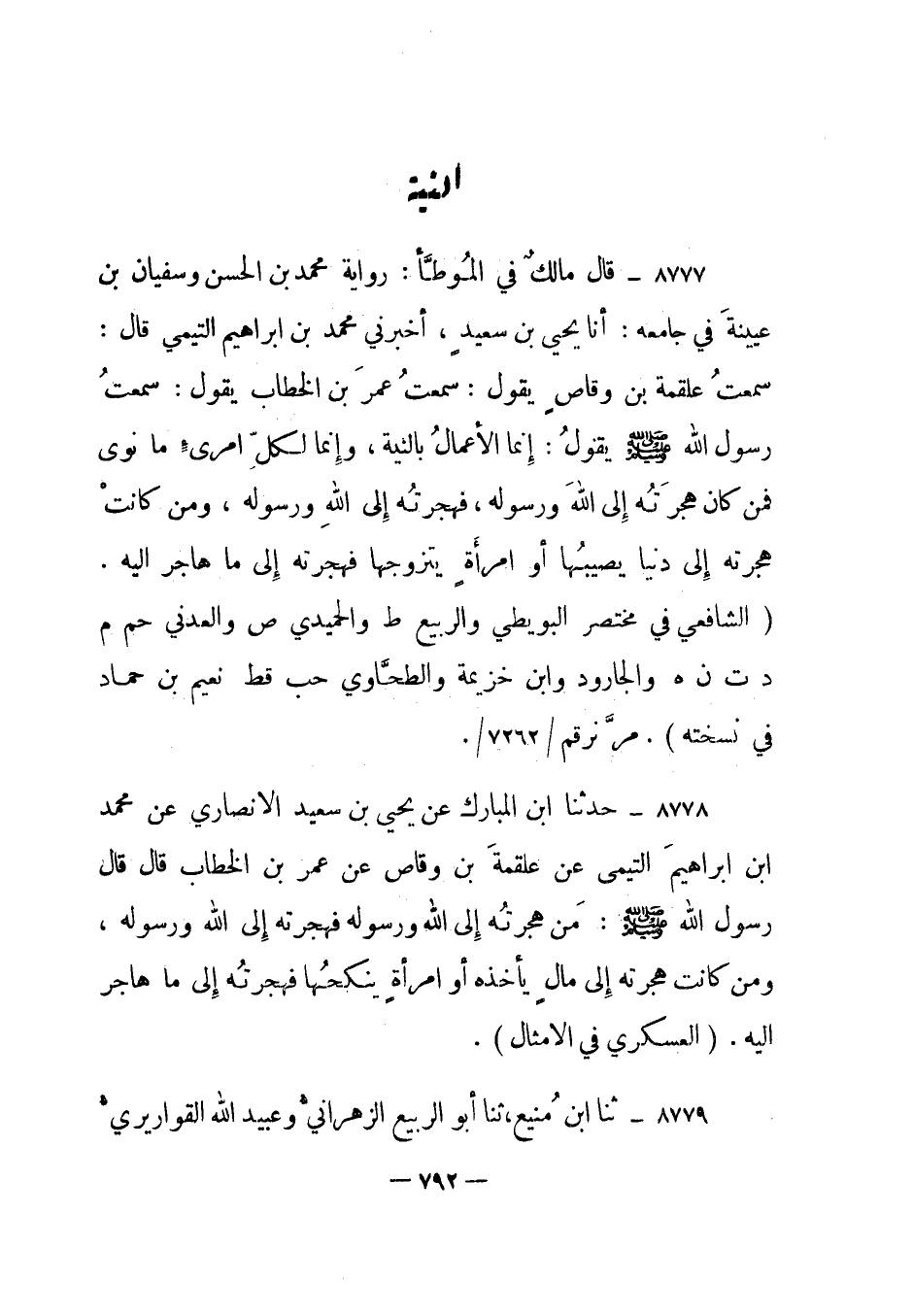 8777- قال مالك في الموطأ: رواية محمد بن الحسن وسفيان بن عيينة في جامعه: أنا يحيى بن سعيد، أخبرني محمد بن إبراهيم التيمي قال: سمعت علقمة بن وقاص يقول: سمعت عمر بن الخطاب يقول: سمعت رسول الله صلى الله عليه وسلم يقول: إنما الأعمال بالنية، وإنما لكل امرئ ما نوى فمن كان هجرته إلى الله ورسوله، فهجرته إلى الله ورسوله، ومن كانت هجرته إلى دنيا يصيبها أو امرأة يتزوجها فهجرته إلى ما هاجر إليه. "الشافعي في مختصر البويطي والربيع "ط" والحميدي "ص" والعدني "حم م د ت ن هـ" والجارود وابن خزيمة والطحاوي "حب قط" نعيم بن حماد في نسخته. مر برقم/7262/.