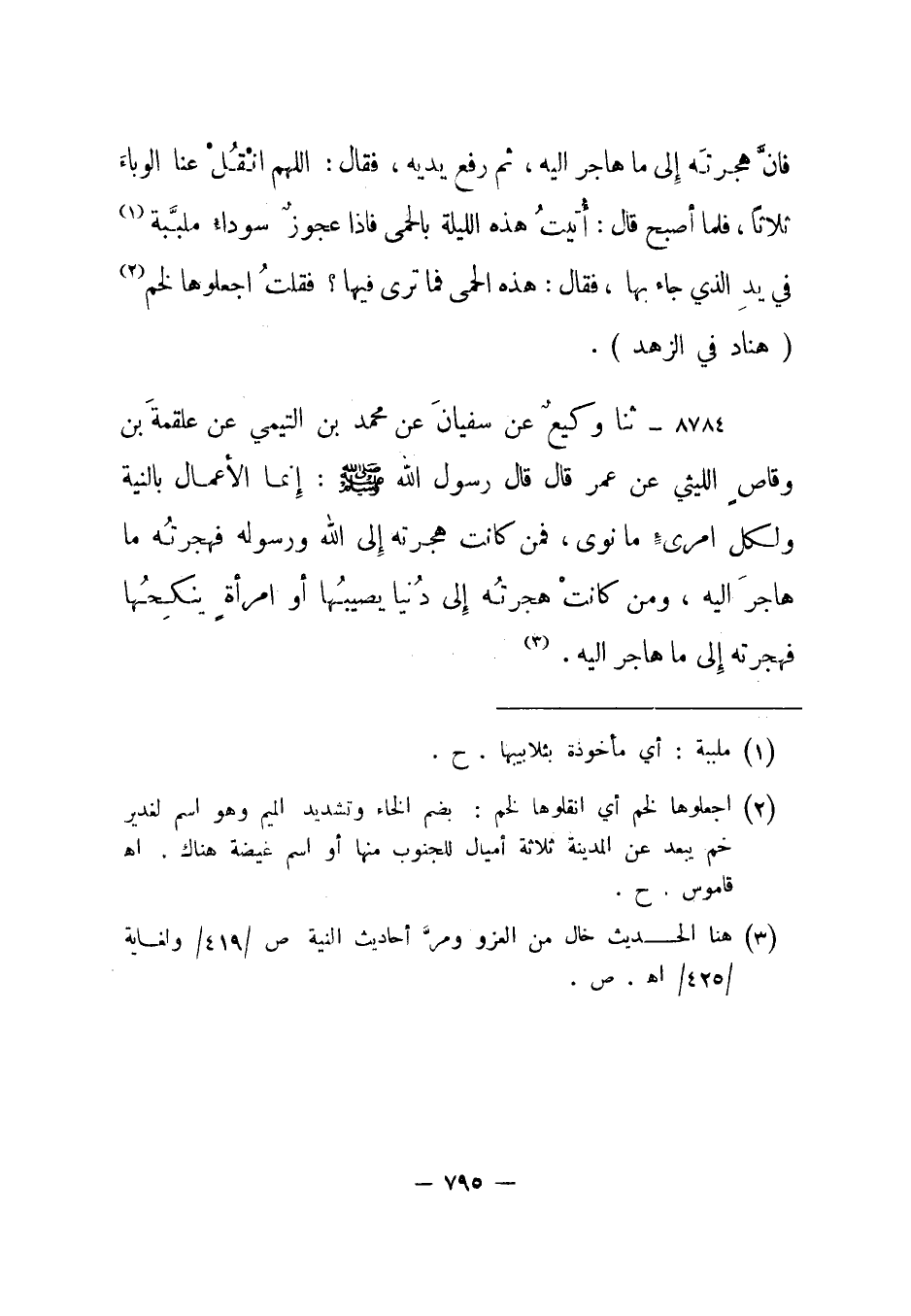 8784- ثنا وكيع عن سفيان عن محمد بن التيمي عن علقمة بن وقاص الليثي عن عمر قال: قال رسول الله صلى الله عليه وسلم: إنما الأعمال بالنية ولكل امرئ ما نوى، فمن كانت هجرته إلى الله ورسوله فهجرته ما هاجر إليه، ومن كانت هجرته إلى دنيا يصيبها أو امرأة ينكحها فهجرته إلى ما هاجر إليه3.