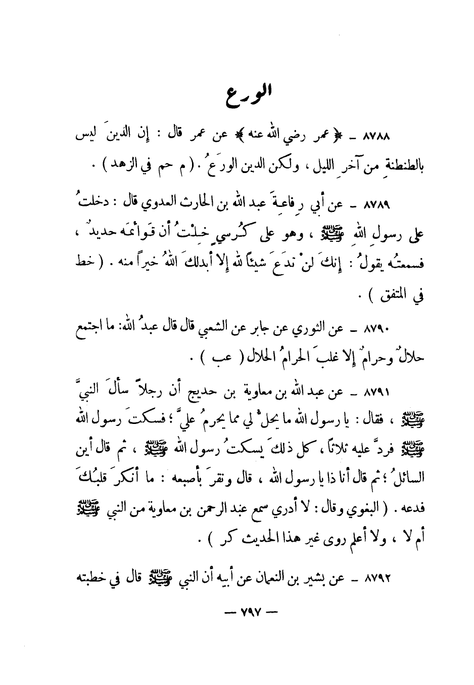 8791- عن عبد الله بن معاوية بن حديج أن رجلا سأل النبي صلى الله عليه وسلم، فقال: يا رسول الله ما يحل لي مما يحرم علي؛ فسكت رسول الله صلى الله عليه وسلم فرد عليه ثلاثا، كل ذلك يسكت رسول الله صلى الله عليه وسلم، ثم قال أين السائل؛ ثم قال: أنا ذا يا رسول الله، قال ونقر بأصبعه: ما أنكر قلبك فدعه. البغوي وقال: لا أدري سمع عبد الرحمن بن معاوية من النبي صلى الله عليه وسلم أم لا، ولا أعلم روى غير هذا الحديث "كر".