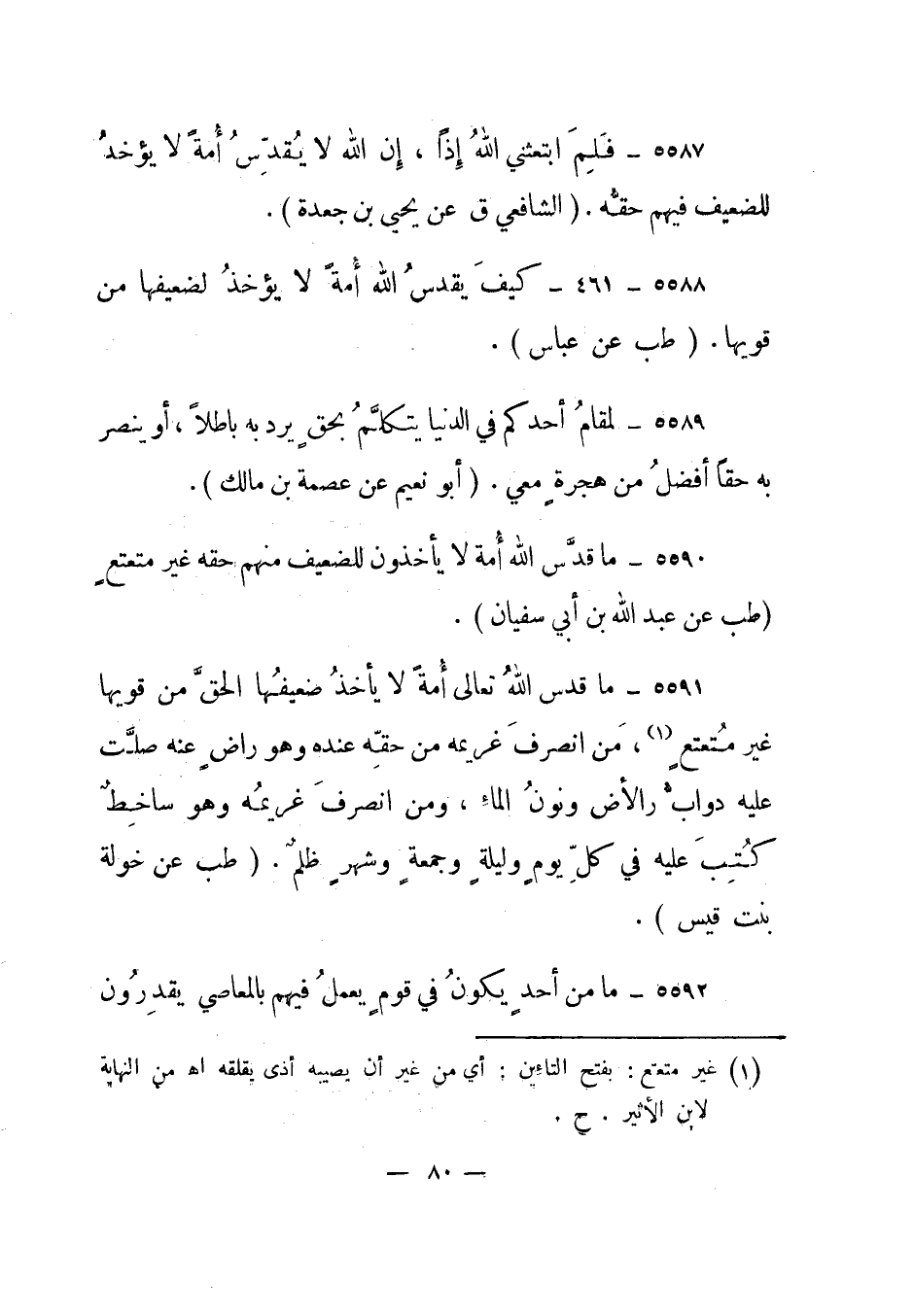 5590- ما قدس الله أمة لا يأخذون للضعيف منهم حقه غير متعتع. "طب عن عبد الله بن أبي سفيان".