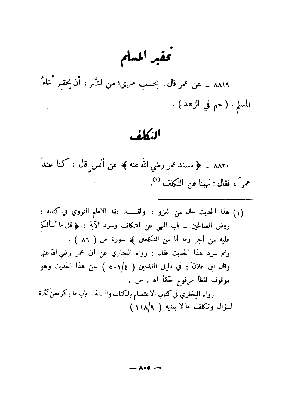 8820- "مسند عمر رضي الله عنه" عن أنس قال: كنا عند عمر، فقال: نهينا عن التكلف1.