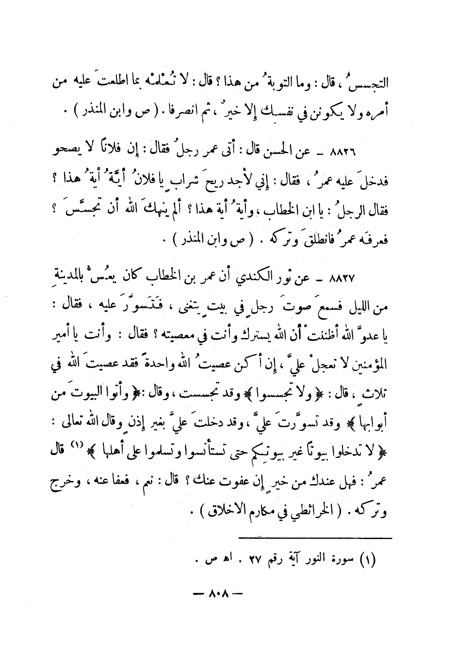 8827- عن ثور الكندي أن عمر بن الخطاب كان يعس بالمدينة من الليل فسمع صوت رجل في بيت يتغنى، فتسور عليه، فقال: يا عدو الله أظننت أن الله يسترك وأنت في معصيته؟ فقال: وأنت يا أمير المؤمنين لا تعجل علي، إن أكن عصيت الله واحدة فقد عصيت الله في ثلاث، قال: {وَلا تَجَسَّسُوا} وقد تجسست، وقال: {وَأْتُوا الْبُيُوتَ مِنْ أَبْوَابِهَا} وقد تسورت علي، وقد دخلت علي بغير إذن وقال الله تعالى: {لا تَدْخُلُوا بُيُوتاً غَيْرَ بُيُوتِكُمْ حَتَّى تَسْتَأْنِسُوا وَتُسَلِّمُوا عَلَى أَهْلِهَا} 1. قال عمر: فهل عندك من خير إن عفوت عنك؟ قال: نعم، فعفا عنه، وخرج وتركه. الخرائطي في مكارم الأخلاق.