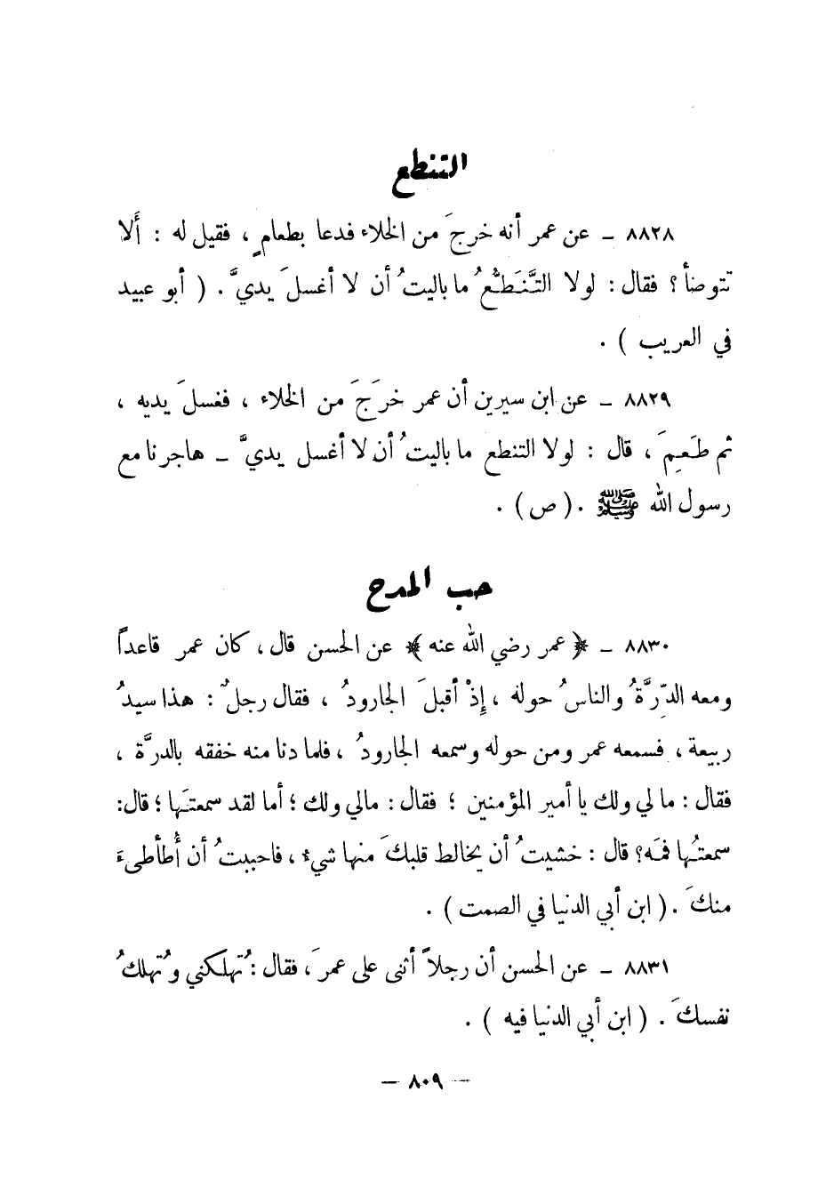 8828- عن عمر أنه خرج من الخلاء فدعا بطعام، فقيل له: ألا تتوضأ؟ فقال: لولا التنطع ما باليت أن لا أغسل يدي. أبو عبيد في العريب.