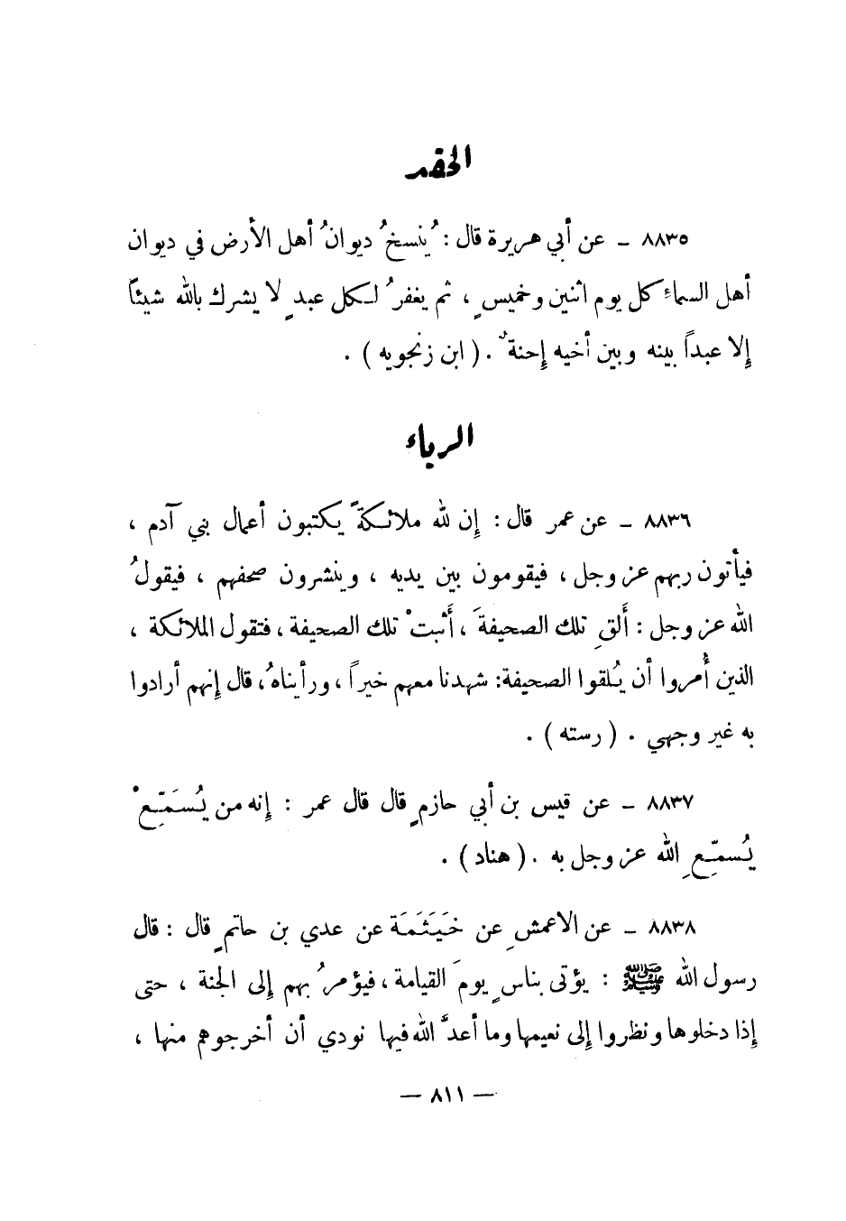 8835- عن أبي هريرة قال: ينسخ ديوان أهل الأرض في ديوان أهل السماء كل يوم اثنين وخميس، ثم يغفر لكل عبد لا يشرك بالله شيئا إلا عبدا بينه وبين أخيه إحنة. ابن زنجويه.