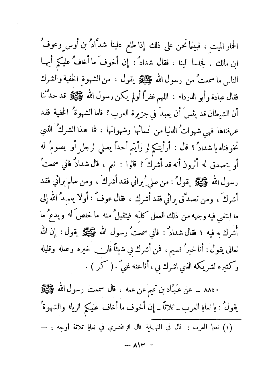 8840- عن عباد بن تميم عن عمه، قال: سمعت رسول الله صلى الله عليه وسلم يقول: يا نعايا العرب1 - ثلاثا - إن أخوف ما أخاف عليكم الرياء والشهوة
