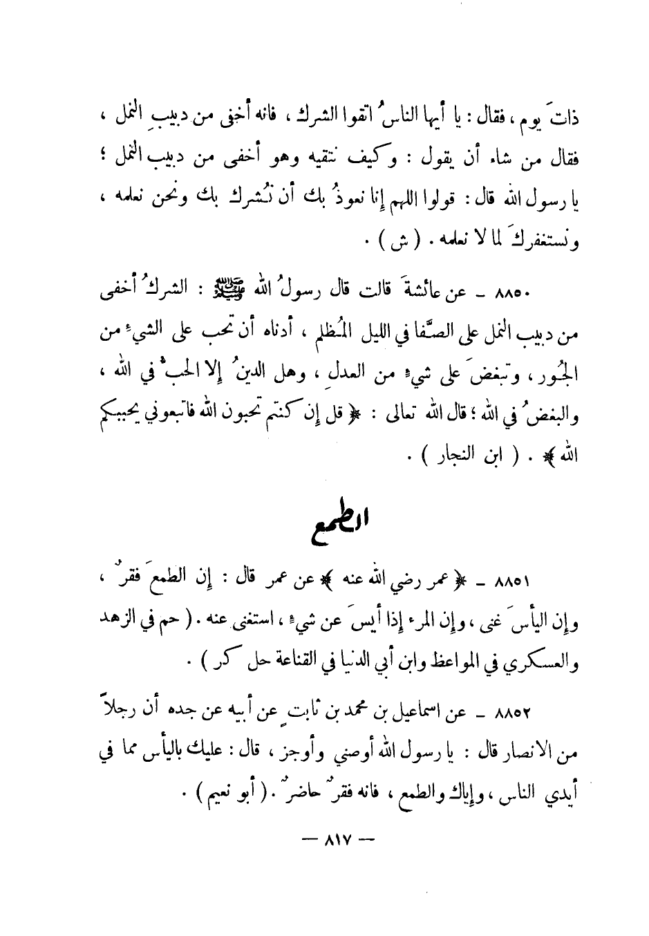 8850- عن عائشة قالت: قال رسول الله صلى الله عليه وسلم: الشرك أخفى من دبيب النمل على الصفا في الليل المظلم، أدناه أن تحب على الشيء من الجور، وتبغض على شيء من العدل، وهل الدين إلا الحب في الله، والبغض في الله؛ قال الله تعالى: {قُلْ إِنْ كُنْتُمْ تُحِبُّونَ اللَّهَ فَاتَّبِعُونِي يُحْبِبْكُمُ اللَّهُ} . ابن النجار.