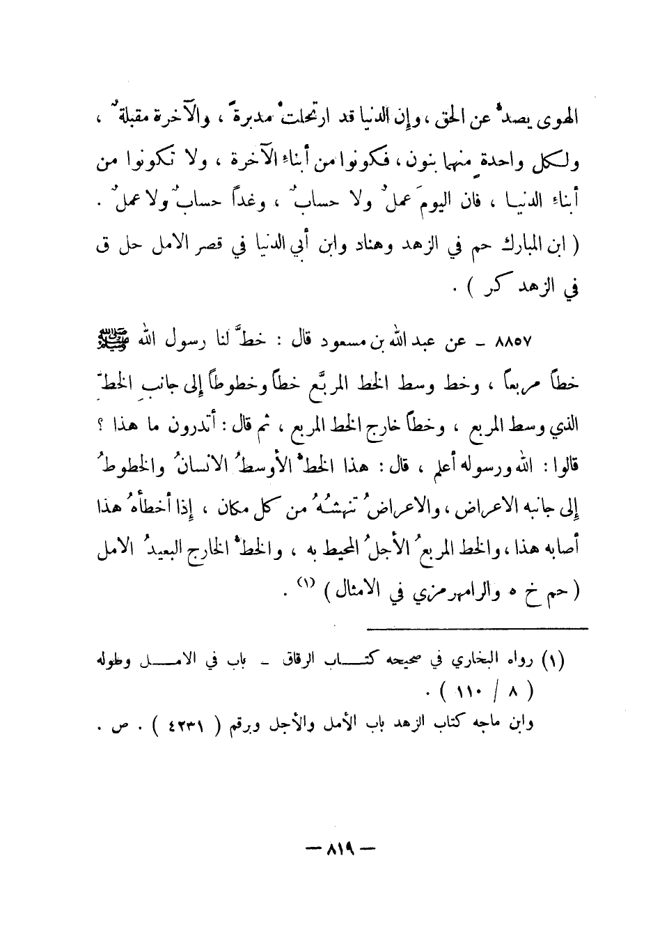 8857- عن عبد الله بن مسعود قال: خط لنا رسول الله صلى الله عليه وسلم خطا مربعا، وخط وسط الخط المربع خطا وخطوطا إلى جانب الخط الذي وسط المربع، وخطا خارج الخط المربع، ثم قال: أتدرون ما هذا؟ قالوا: الله ورسوله أعلم، قال: هذا الخط الأوسط الإنسان والخطوط إلى جانبه الأعراض، والأعراض تنهشه من كل مكان، إذا أخطأه هذا أصابه هذا، والخط المربع الأجل المحيط به، والخط الخارج البعيد الأمل. "حم خ هـ" والرامهرمزي في الأمثال1.