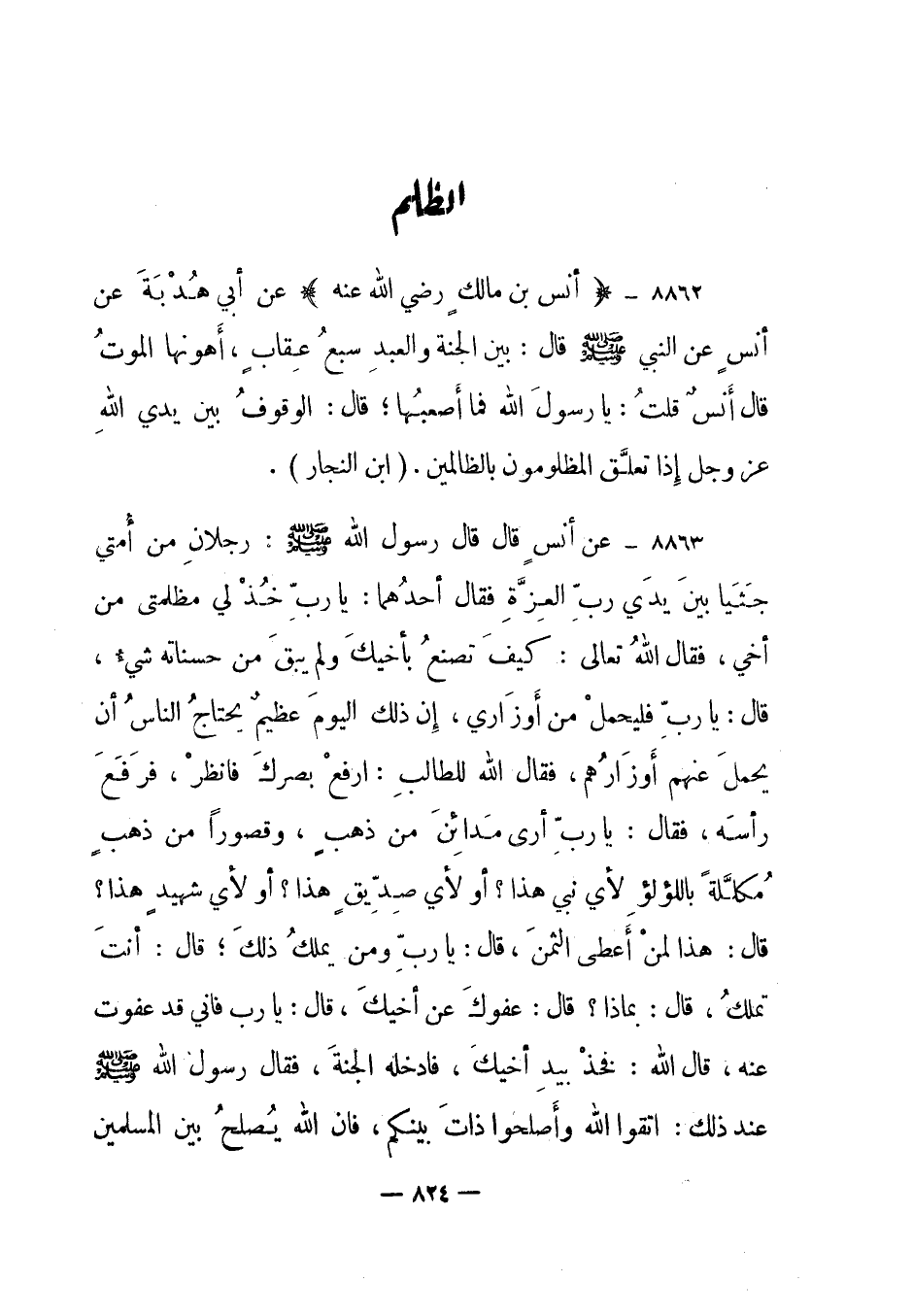 8862- "أنس بن مالك رضي الله عنه" عن أبي هدبة عن أنس عن النبي صلى الله عليه وسلم قال: بين الجنة والعبد سبع عقاب، أهونها الموت قال أنس قلت: يا رسول الله فما أصعبها؛ قال: الوقوف بين يدي الله عز وجل إذا تعلق المظلومون بالظالمين. ابن النجار.