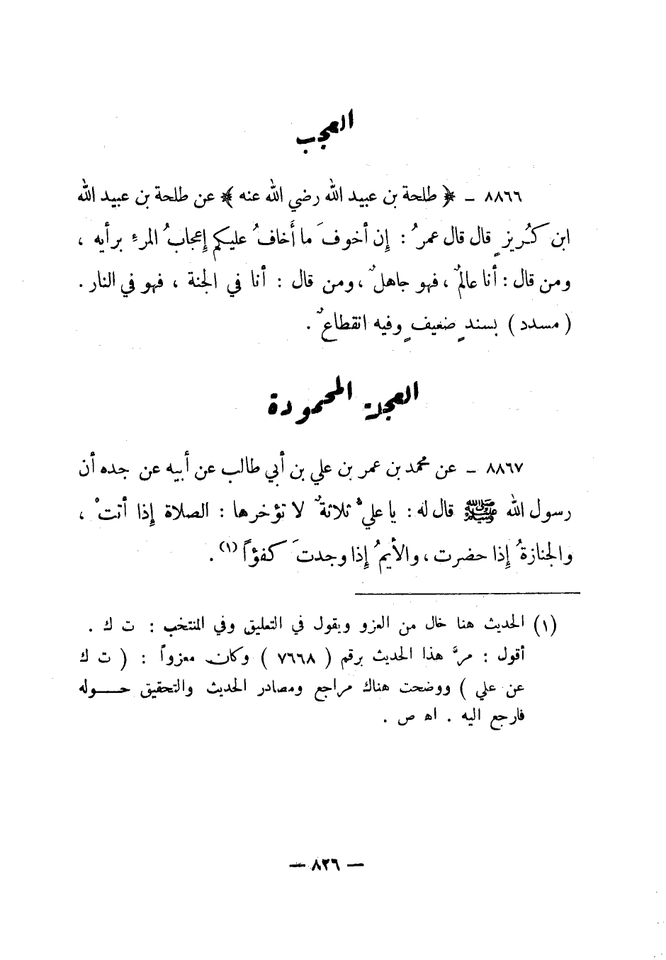 8866- "طلحة بن عبيد الله رضي الله عنه" عن طلحة بن عبيد الله بن كريز قال: قال عمر: إن أخوف ما أخاف عليكم إعجاب المرء برأيه، ومن قال: أنا عالم، فهو جاهل، ومن قال: أنا في الجنة، فهو في النار. مسدد بسند ضعيف وفيه انقطاع.