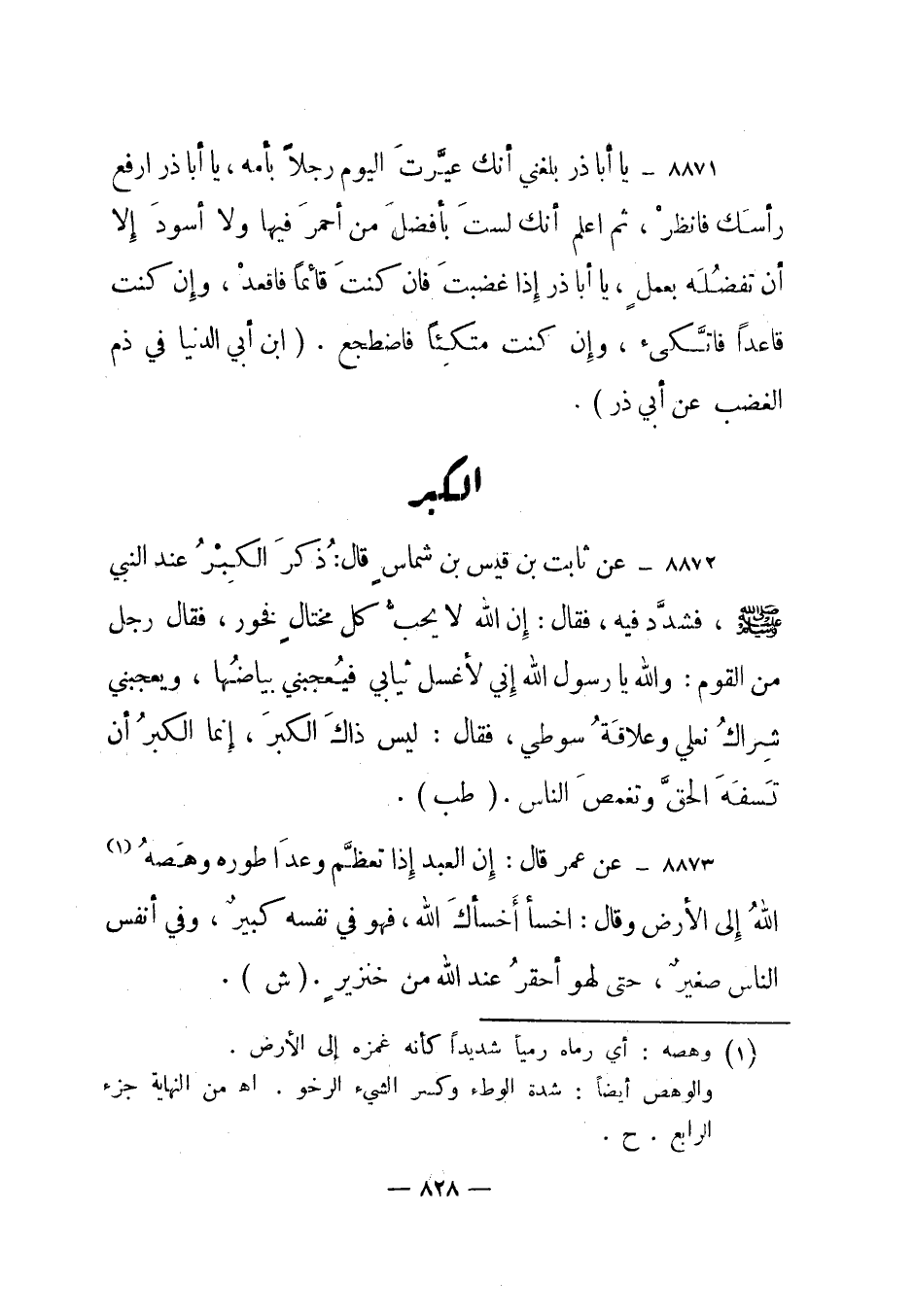 8871- يا أبا ذر بلغني أنك عيرت اليوم رجلا بأمه، يا أبا ذر ارفع رأسك فانظر، ثم اعلم أنك لست بأفضل من أحمر فيها ولا أسود إلا أن تفضله بعمل، يا أبا ذر إذا غضبت فإن كنت قائما فاقعد، وإن كنت قاعدا فاتكئ، وإن كنت متكئا فاضطجع. ابن أبي الدنيا في ذم الغضب عن أبي ذر.