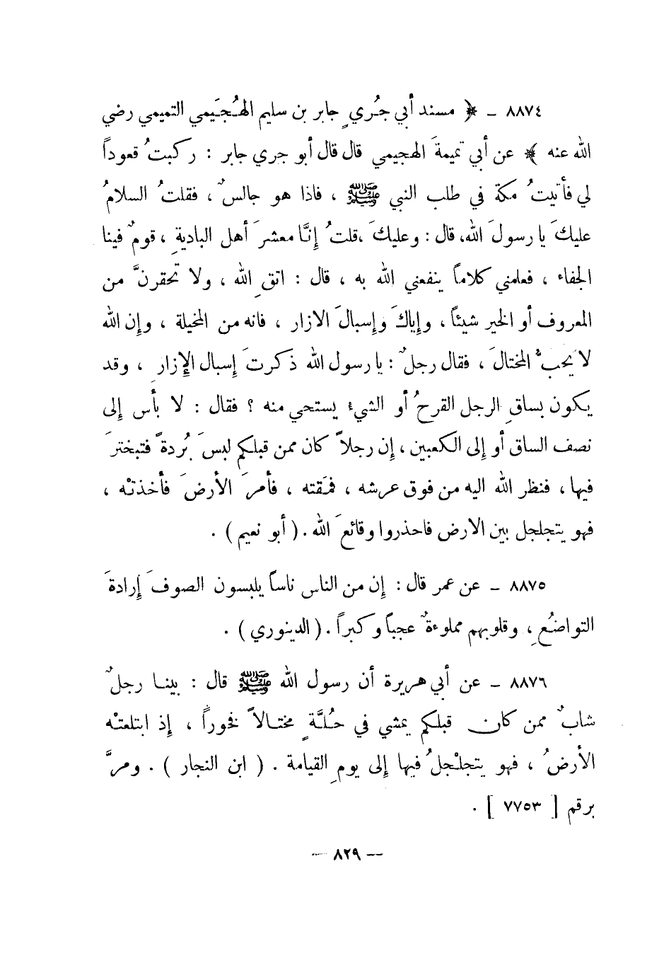8874- "مسند أبي جري جابر بن سليم الهجيمي التميمي رضي الله عنه" عن أبي تميمة الهجيمي قال: قال أبو جري جابر: ركبت قعودا لي فأتيت مكة في طلب النبي صلى الله عليه وسلم، فإذا هو جالس، فقلت السلام عليك يا رسول الله، قال: وعليك، قلت إنا معشر أهل البادية، قوم فينا الجفاء، فعلمني كلاما ينفعني الله به، قال: اتق الله، ولا تحقرن من المعروف أو الخير شيئا، وإياك وإسبال الإزار، فإنه من المخيلة، وإن الله لا يحب المختال فقال رجل: يا رسول الله ذكرت إسبال الإزار، وقد يكون بساق الرجل القرح أو الشيء يستحي منه؟ فقال: لا بأس إلى نصف الساق أو إلى الكعبين، إن رجلا كان ممن قبلكم لبس بردة فتبختر فيها، فنظر الله إليه من فوق عرشه، فمقته، فأمر الأرض فأخذته، فهو يتجلجل بين الأرض فاحذروا وقائع الله. أبو نعيم.