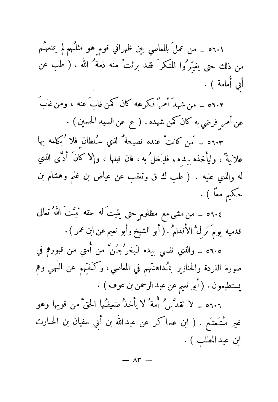 5601- من عمل بالمعاصي بين ظهراني قوم هو مثلهم لم يمنعهم من ذلك حتى يغيروا المنكر فقد برئت منه ذمة الله. "طب عن أبي أمامة".