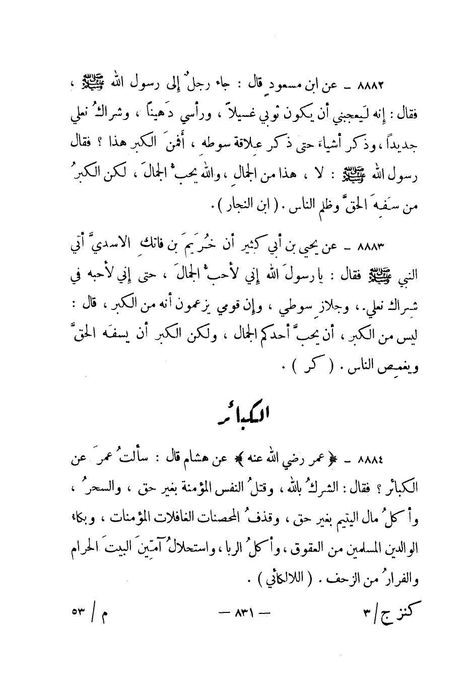 8884- "عمر رضي الله عنهط عن هشام قال: سألت عمر عن الكبائر؟ فقال: الشرك بالله، وقتل النفس المؤمنة بغير حق، والسحر، وأكل مال اليتيم بغير حق، وقذف المحصنات الغافلات المؤمنات، وبكاء الوالدين المسلمين من العقوق، وأكل الربا، واستحلال آمين البيت الحرام والفرار من الزحف.