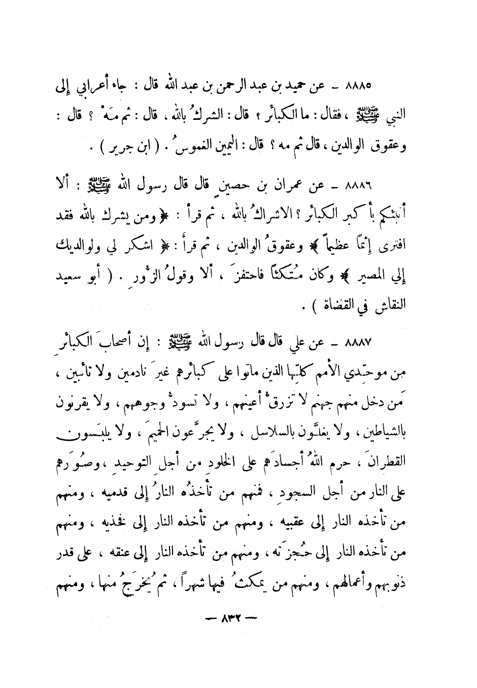 8885- عن حميد بن عبد الرحمن بن عبد الله قال: جاء أعرابي إلى النبي صلى الله عليه وسلم، فقال: ما الكبائر؟ قال: الشرك بالله، قال: ثم مه؟ قال: وعقوق الوالدين، قال ثم مه؟ قال: اليمين الغموس. ابن جرير.
