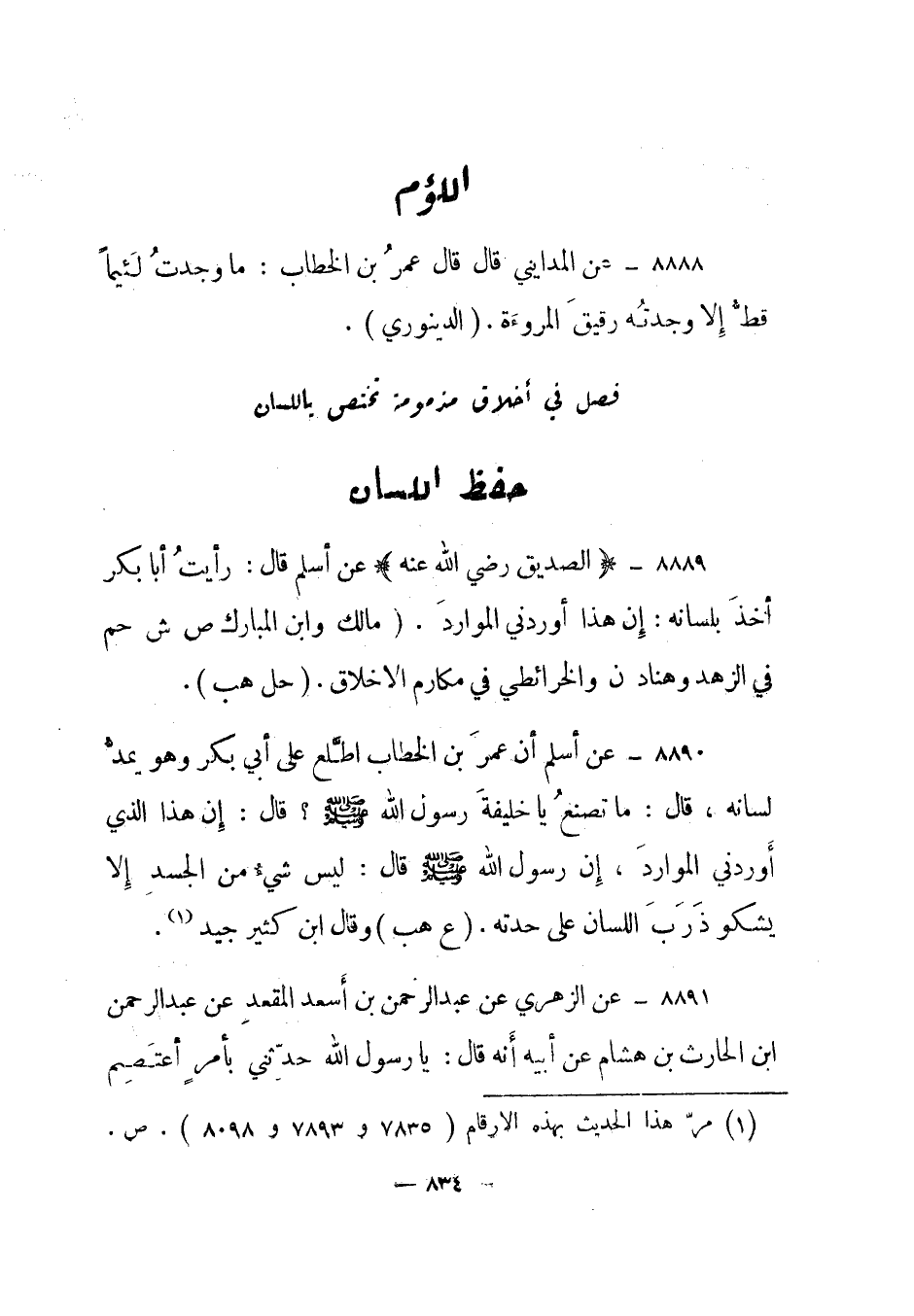 8890- عن أسلم أن عمر بن الخطاب اطلع على أبي بكر وهو يمد لسانه، قال: ما تصنع يا خليفة رسول الله صلى الله عليه وسلم؟ قال: إن هذا الذي أوردني الموارد، إن رسول الله صلى الله عليه وسلم قال: ليس شيء من الجسد إلا يشكو ذرب اللسان على حدته. "ع هب" وقال ابن كثير جيد1.