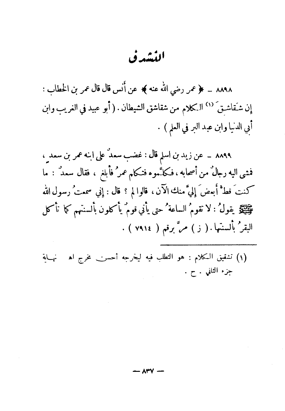 8898- "عمر رضي الله عنه" عن أنس قال: قال عمر بن الخطاب: إن شقاشق1 الكلام من شقاشق الشيطان. أبو عبيد في الغريب وابن أبي الدنيا وابن عبد البر في العلم.