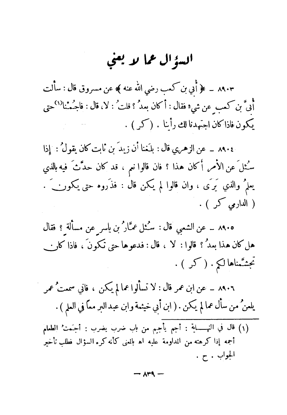8906- عن ابن عمر قال: لا تسألوا عما لم يكن، فإني سمعت عمر يلعن من سأل عما لم يكن. ابن أبي خثيمة وابن عبد البر معا في العلم.