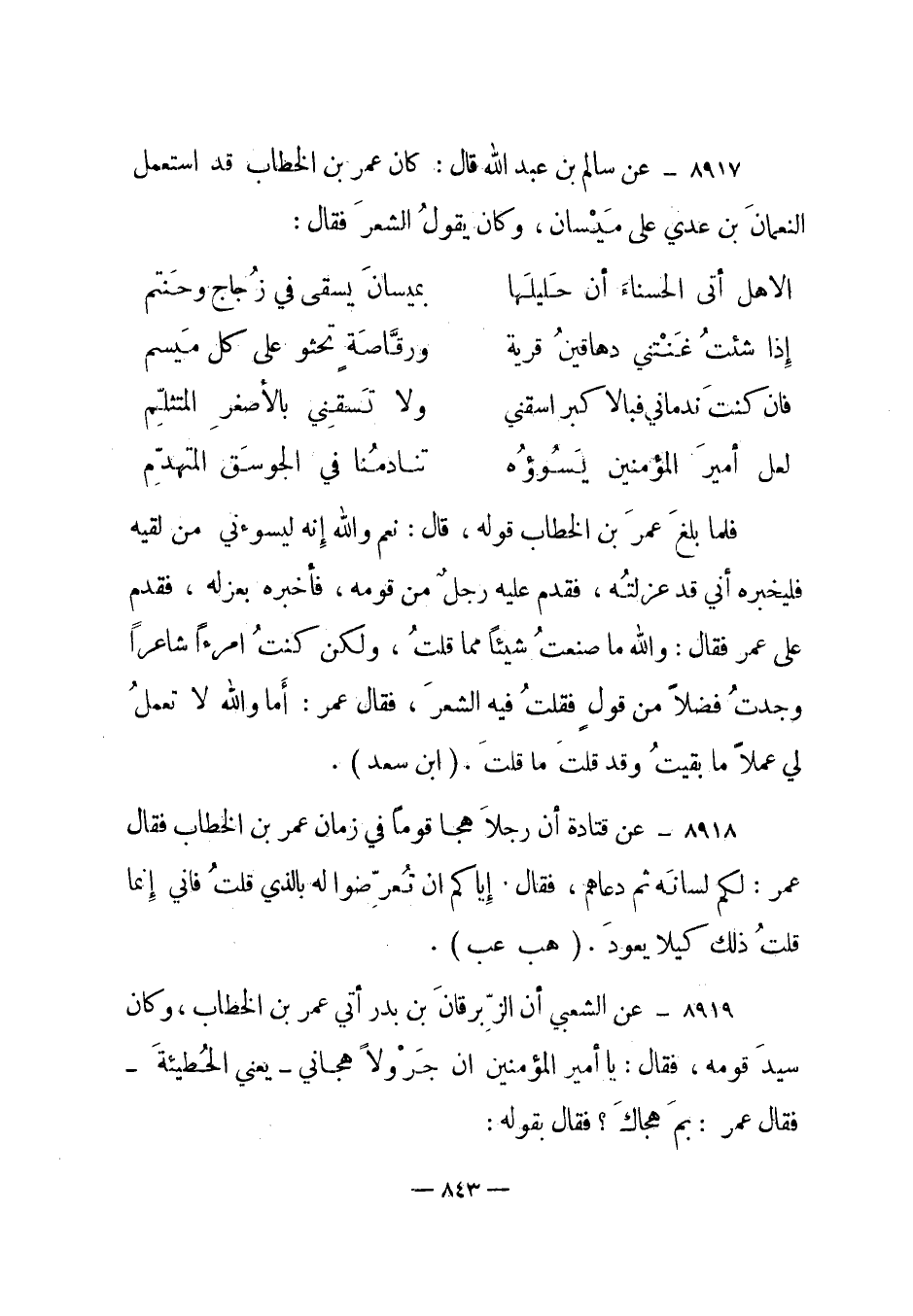 8917- عن سالم بن عبد الله قال: كان عمر بن الخطاب قد استعمل النعمان بن عدي على ميسان، وكان يقول الشعر فقال: