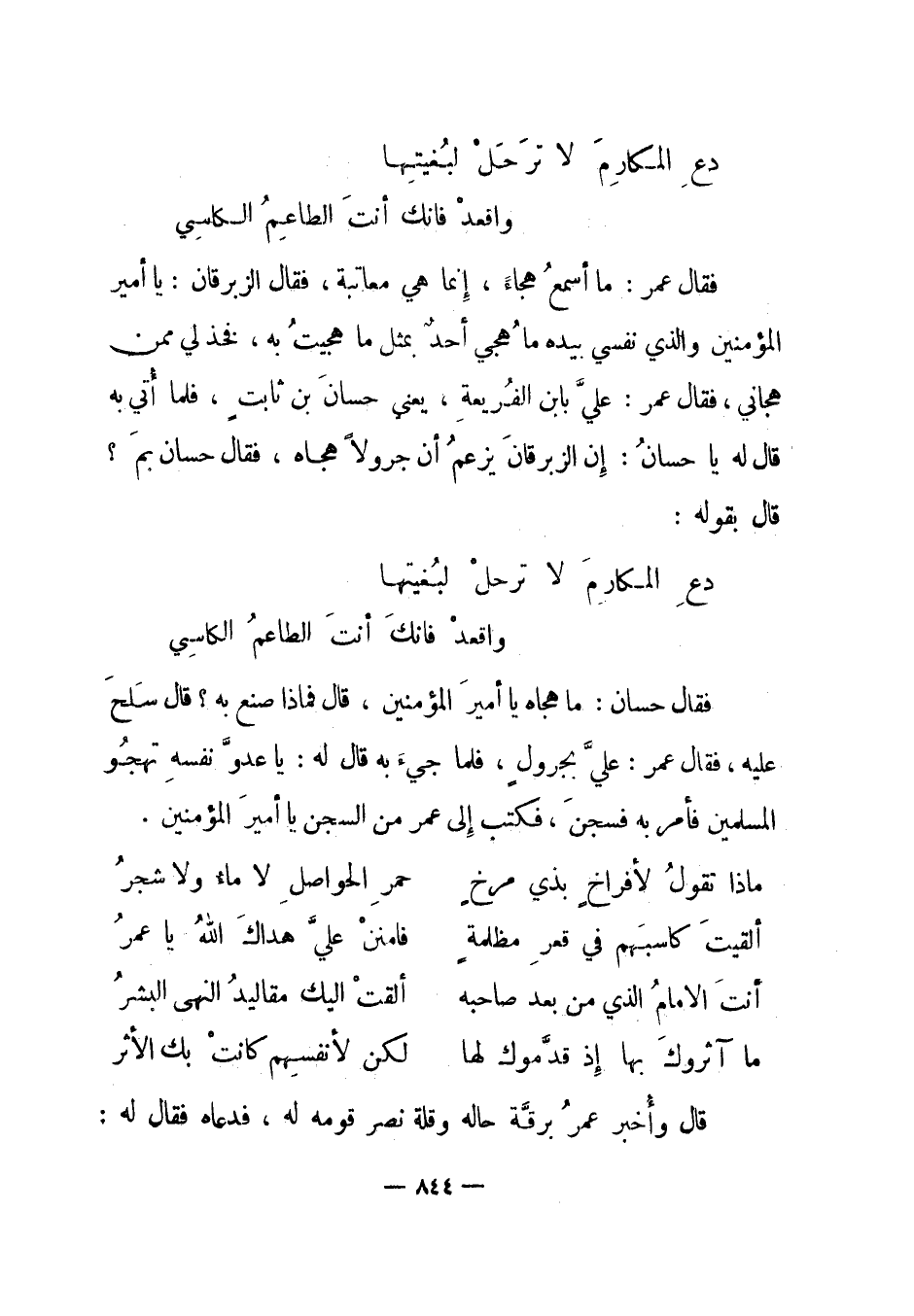 فقال عمر: ما أسمع هجاء، إنما هي معاتبة، فقال الزبرقان: ياأمير المؤمنين والذي نفسي بيده ما هجي أحد بمثل ما هجيت به، فخذ لي ممن هجاني، فقال عمر: علي بابن الفريعة، يعني حسان بن ثابت، فلما أتي به قال له يا حسان: إن الزبرقان يزعم أن جرولا هجاه، فقال حسان بم؟ قال بقوله: