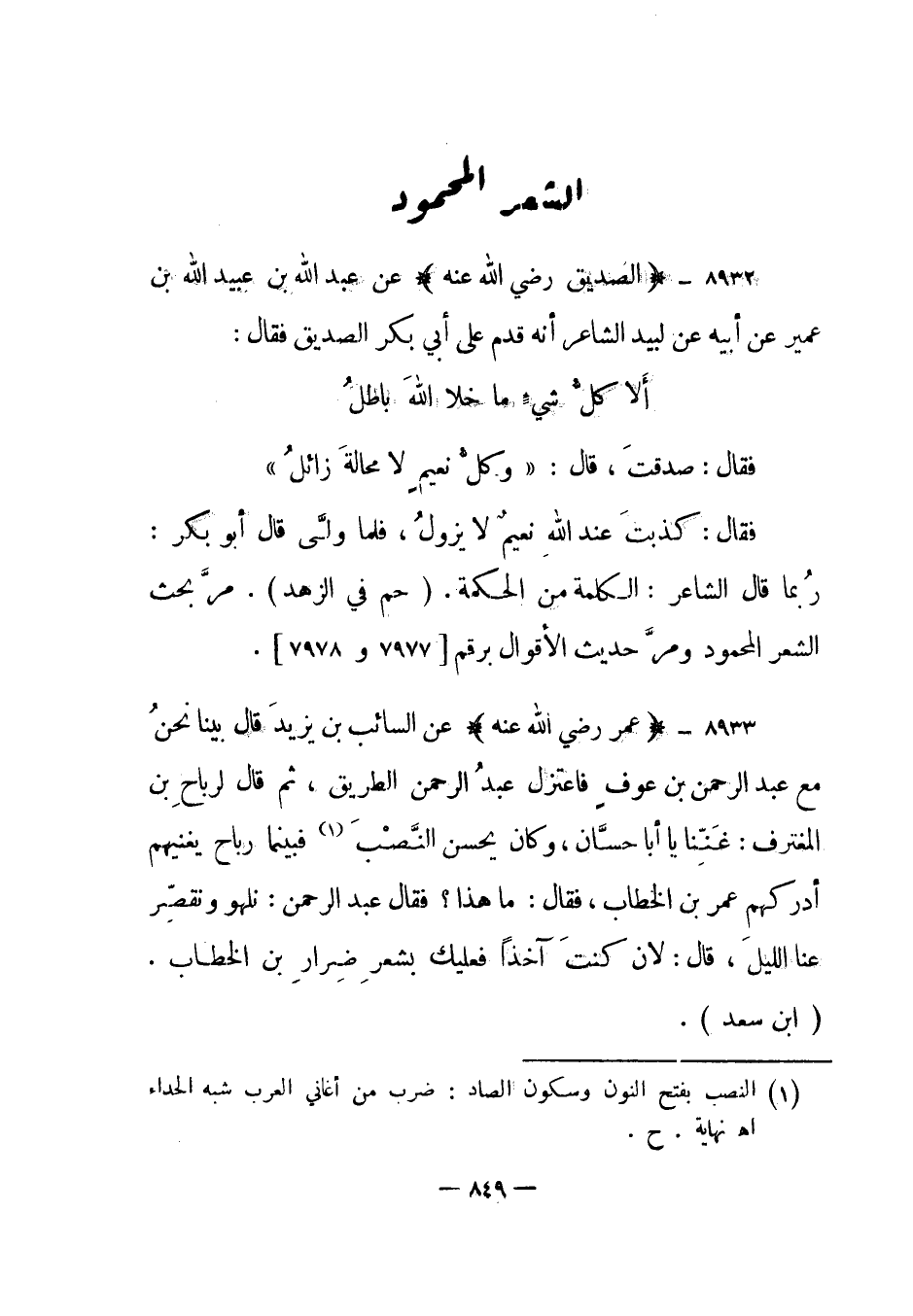 8933- "عمر رضي الله عنه" عن السائب بن يزيد قال بينا نحن مع عبد الرحمن بن عوف فاعتزل عبد الرحمن الطريق، ثم قال لرباح بن المغترف: غننا يا أبا حسان، وكان يحسن النصب1 فبينما رباح يغنيهم أدركهم عمر بن الخطاب، فقال: ما هذا؟ فقال عبد الرحمن: نلهو ونقصر عنا الليل، قال: لأن كنت آخذا فعليك بشعر ضرار بن الخطاب. ابن سعد.