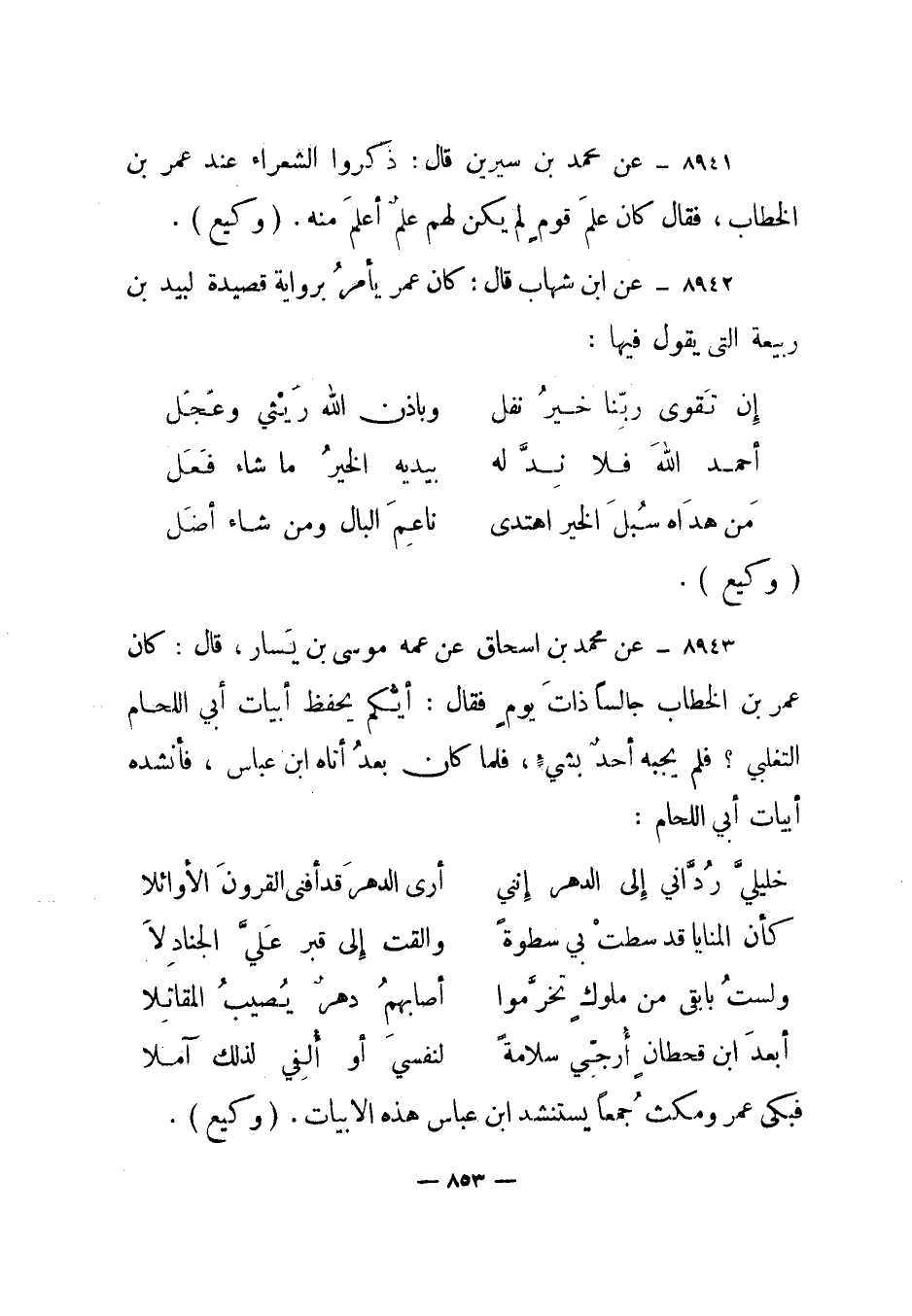 8942- عن ابن شهاب قال: كان عمر يأمر برواية قصيدة لبيد بن ربيعة التي يقول فيها: