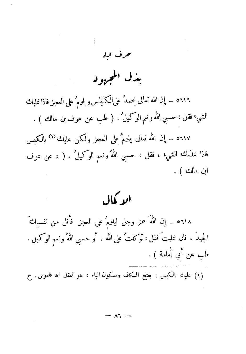 5618- إن الله عز وجل ليلوم على العجز فأنل من نفسك الجهد، فإن غلبت فقل: توكلت على الله، أو حسبي الله ونعم الوكيل. "طب عن أبي أمامة".