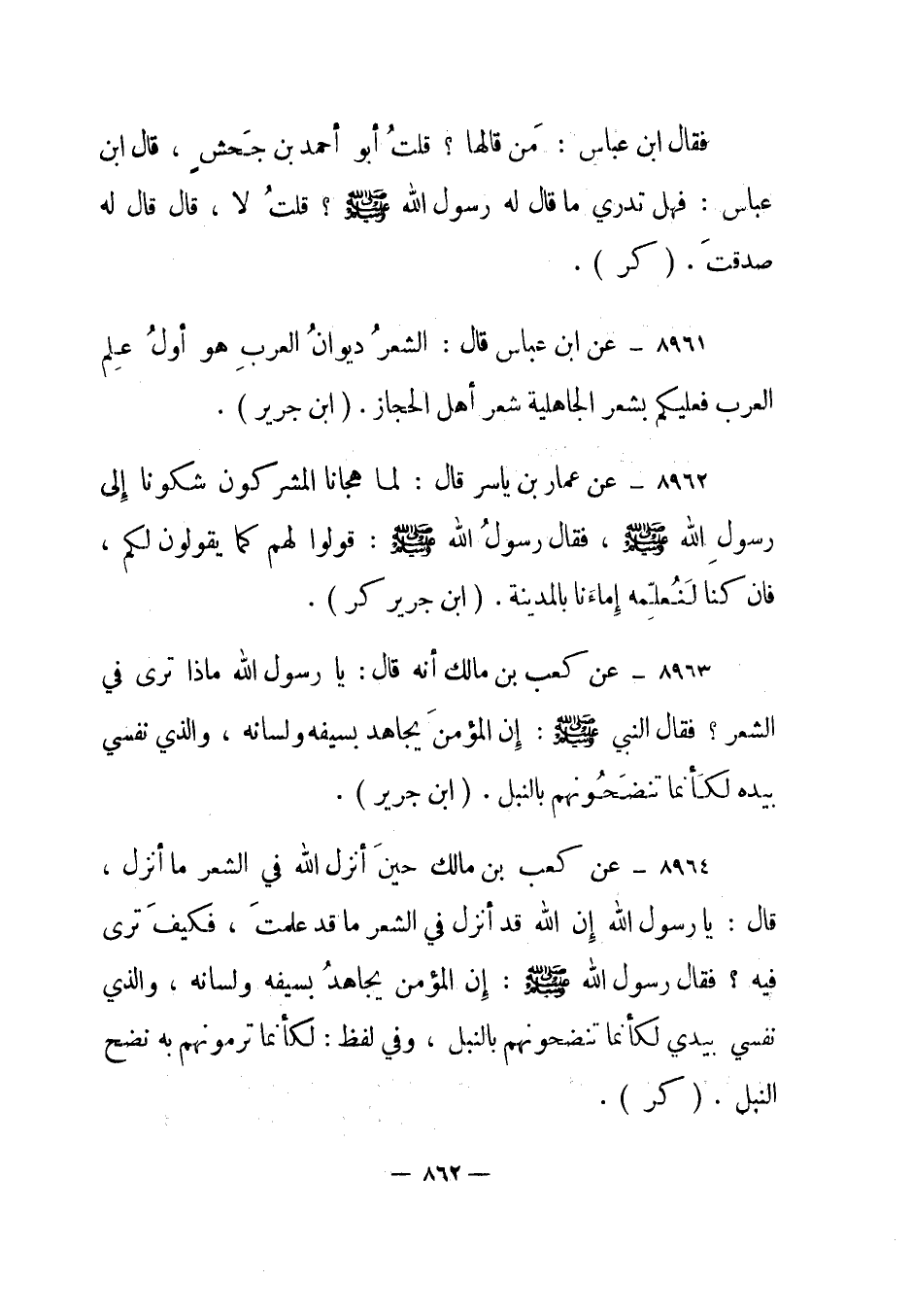 8963- عن كعب بن مالك أنه قال: يا رسول الله ماذا ترى في الشعر؟ فقال النبي صلى الله عليه وسلم: إن المؤمن يجاهد بسيفه ولسانه، والذي نفسي بيده لكأنما تنضحونهم بالنبل. ابن جرير.