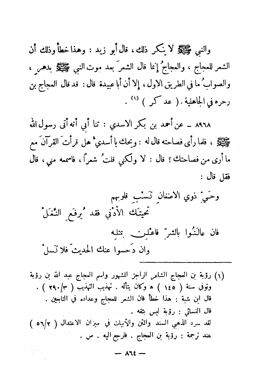 والنبي صلى الله عليه وسلم لا ينكر ذلك، قال أبو زيد: وهذا خطأ وذلك أن الشعر للعجاج، والعجاج إنما قال الشعر بعد موت النبي صلى الله عليه وسلم بدهر، والصواب ما في الطريق الأول، إلا أن أبا عبيدة قال: قد قال العجاج بن رحره في الجاهلية. "عد كر"1.
