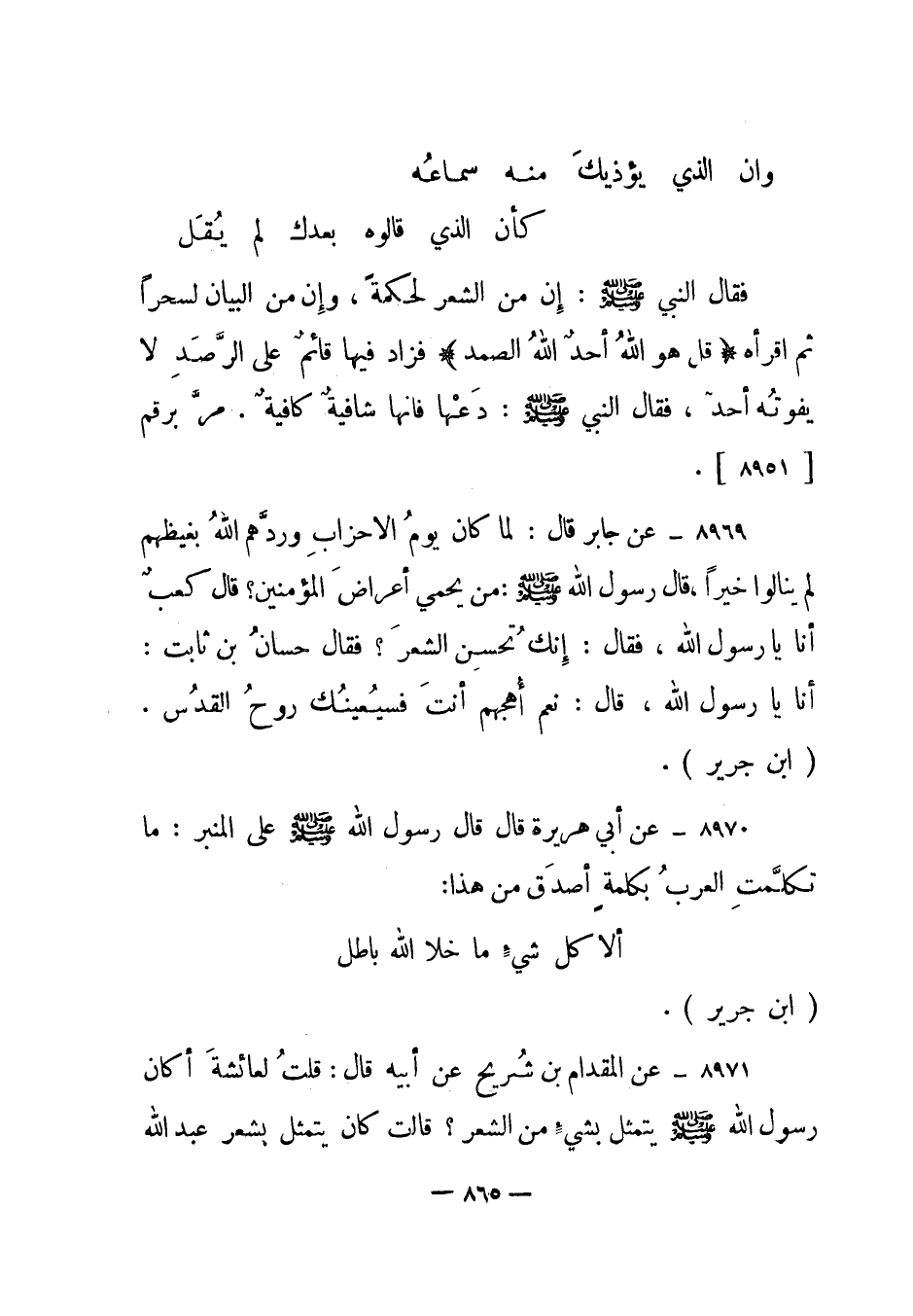8971- عن المقدام بن شريح عن أبيه قال: قلت لعائشة أكان رسول الله صلى الله عليه وسلم يتمثل بشيء من الشعر؟ قالت: كان يتمثل بشعر عبد الله