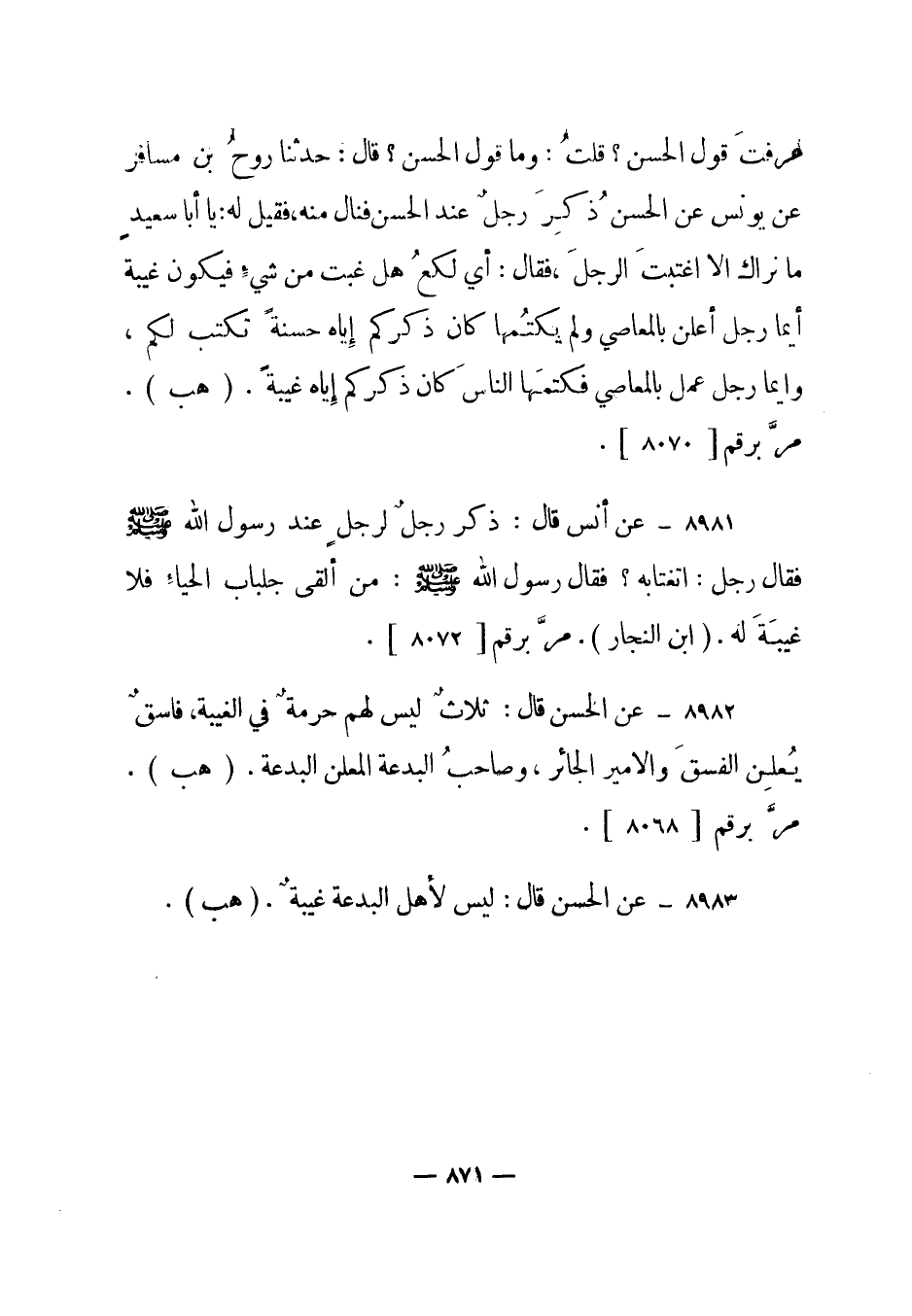 8983- عن الحسن قال: ليس لأهل البدعة غيبة. "هب".