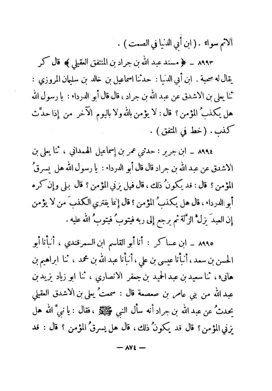 8993- "مسند عبد الله بن جراد بن المنتفق العقيلي" قال "كر": يقال له صحبة. ابن أبي الدنيا: حدثنا إسماعيل بن خالد بن سليمان المروزي: ثنا يعلى بن الأشدق عن عبد الله بن جراد، قال: قال أبو الدرداء: يا رسول الله هل يكذب المؤمن؟ قال: لا يؤمن بالله ولا باليوم الآخر من إذا حدث كذب. "خط" في المتفق.