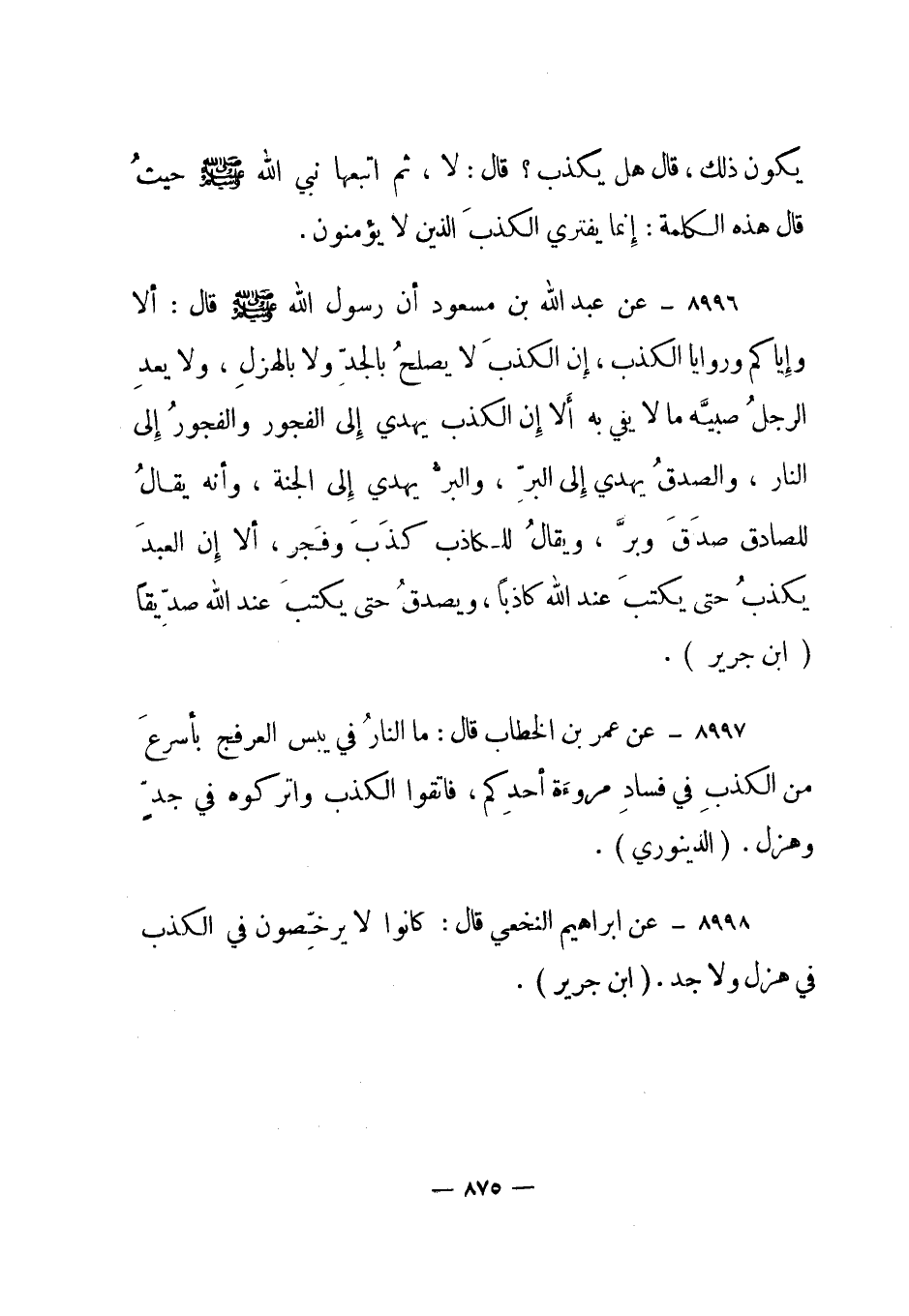 8998- عن إبراهيم النخعي قال: كانوا لا يرخصون في الكذب في هزل ولا جد. ابن جرير.