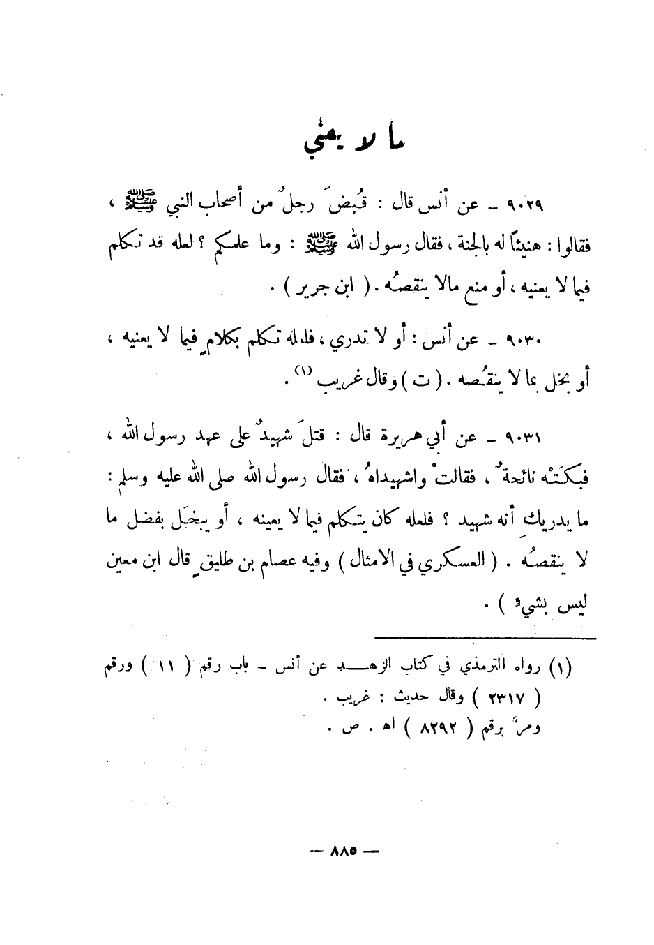 9029- عن أنس قال: قبض رجل من أصحاب النبي صلى الله عليه وسلم، فقالوا: هنيئا له بالجنة، فقال رسول الله صلى الله عليه وسلم: وما علمكم؟ لعله قد تكلم فيما لا يعنيه، أو منع ما لا ينقصه. ابن جرير.