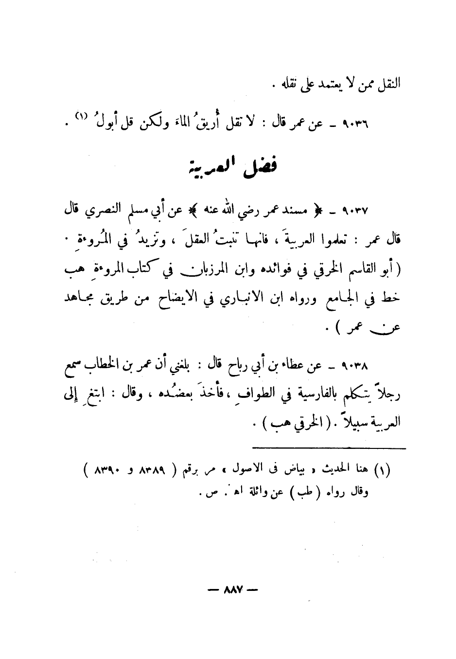 9037- "مسند عمر رضي الله عنه" عن أبي مسلم النصري قال: قال عمر: تعلموا العربية، فإنها تنبت العقل، وتزيد في المروءة. أبو القاسم الخرقي في فوائده وابن المرزبان في كتاب المروءة "هب خط" في الجامع ورواه ابن الأنباري في الإيضاح من طريق مجاهد عن عمر.