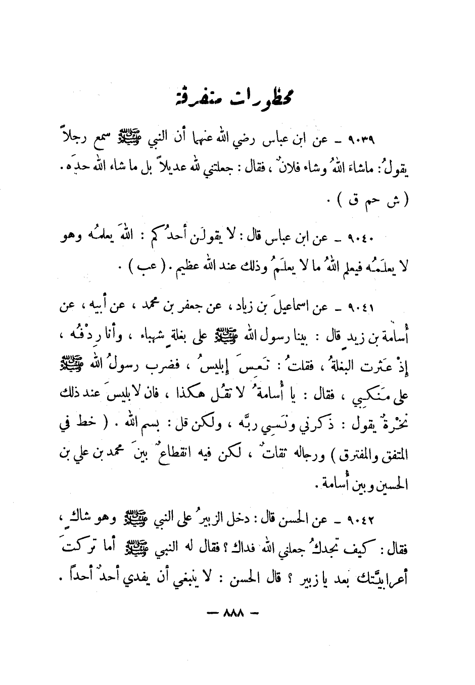 9039- عن ابن عباس رضي الله عنهما أن النبي صلى الله عليه وسلم سمع رجلا يقول: ما شاء الله وشاء فلان، فقال: جعلتني لله عديلا بل ما شاء الله حده. "ش حم ق".