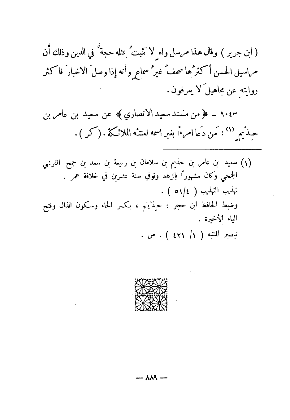 9043- "من مسند سعيد الأنصاري" عن سعيد بن عامر بن حذيم1: من دعا امرءا بغير اسمه لعنته الملائكة. "كر".