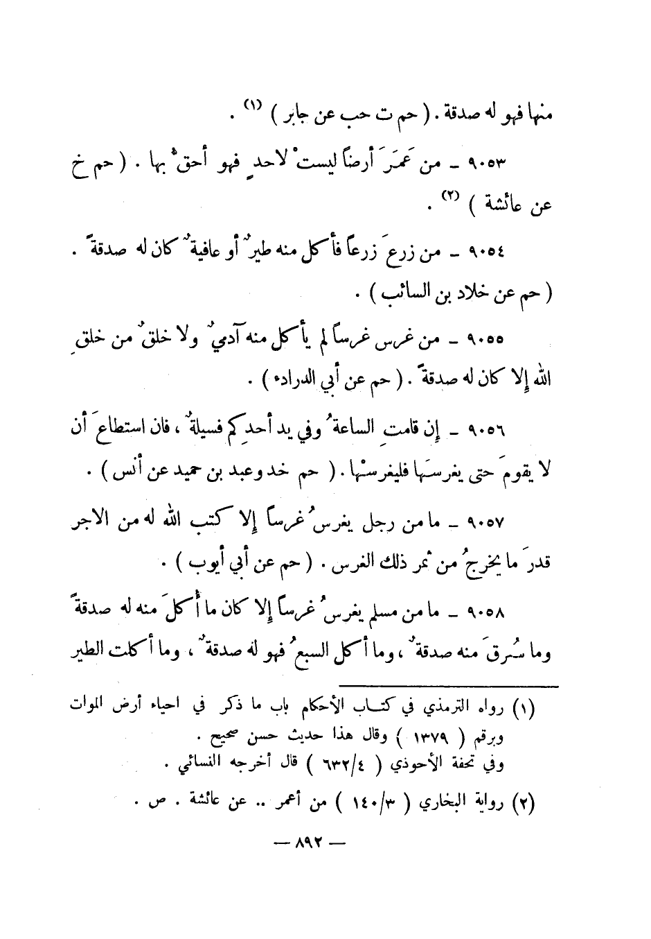 9058- ما من مسلم يغرس غرسا إلا كان ما أكل منه له صدقة وما سرق منه صدقة، وما أكل السبع فهو له صدقة، وما أكلت الطير