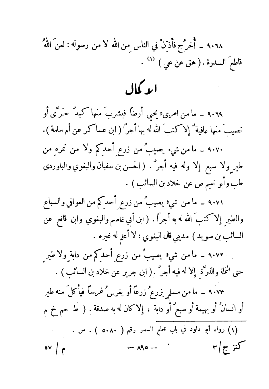 9072- ما من شيء يصيب من زرع أحدكم من دابة ولا طير حتى النملة والذرة إلا له فيه أجر. ابن جرير عن خلاد بن السائب.