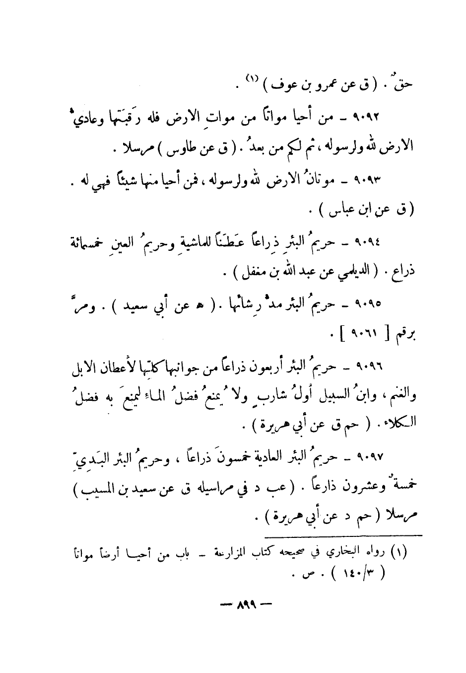 9097- حريم البئر العادية خمسون ذراعا، وحريم البئر البدي خمسة وعشرون ذراعا. "عب د" في مراسيله "ق" عن سعيد بن المسيب مرسلا "حم د" عن أبي هريرة.
