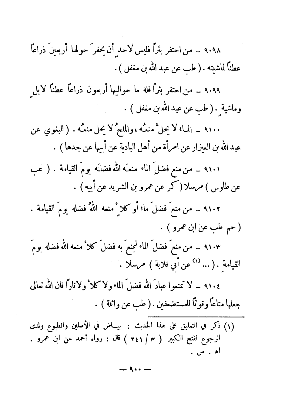 9098- من احتفر بئرا فليس لأحد أن يحفر حولها أربعين ذراعا عطنا لماشيته. "طب" عن عبد الله بن مغفل.